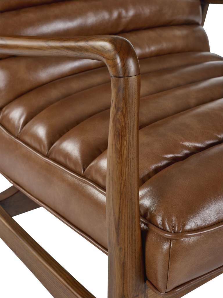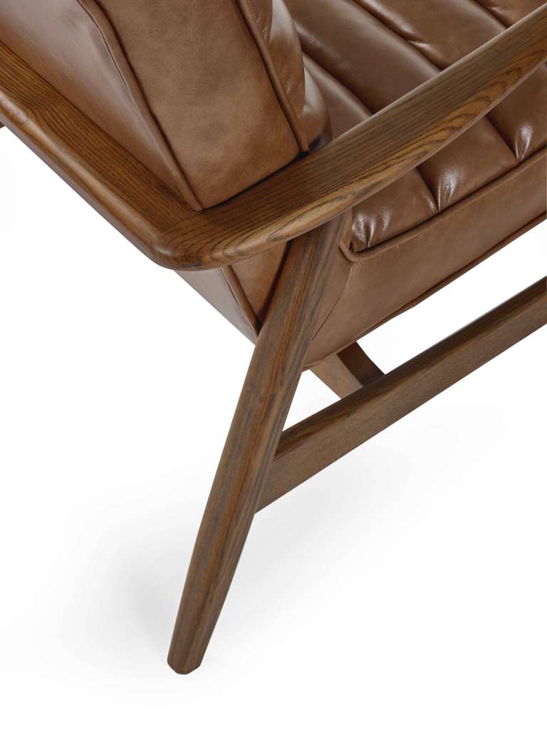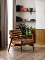 Bring timeless charm to your space with the Marshall Accent Chair in Brown. Crafted with a solid wood frame that showcases natural beauty, it pairs durability with sleek design. The ribbed cushioned seat, upholstered in smooth vintage brown faux leather, offers exceptional comfort and a retro-inspired look. Whether enhancing a cosy corner or anchoring your decor, it makes an inviting and stylish addition to any room.