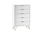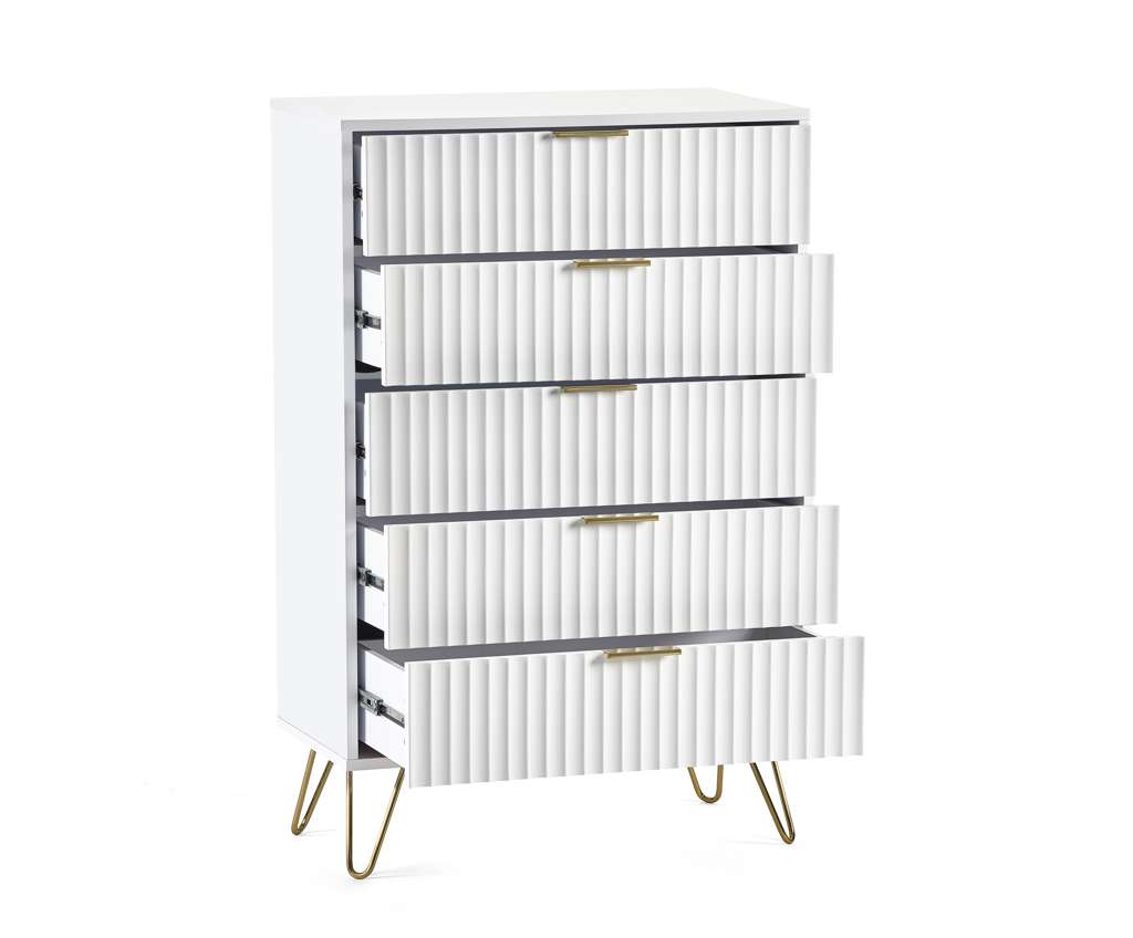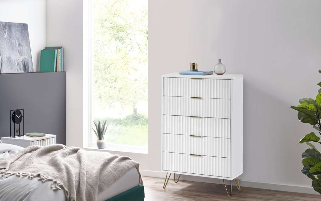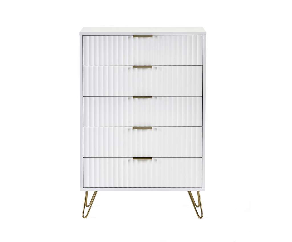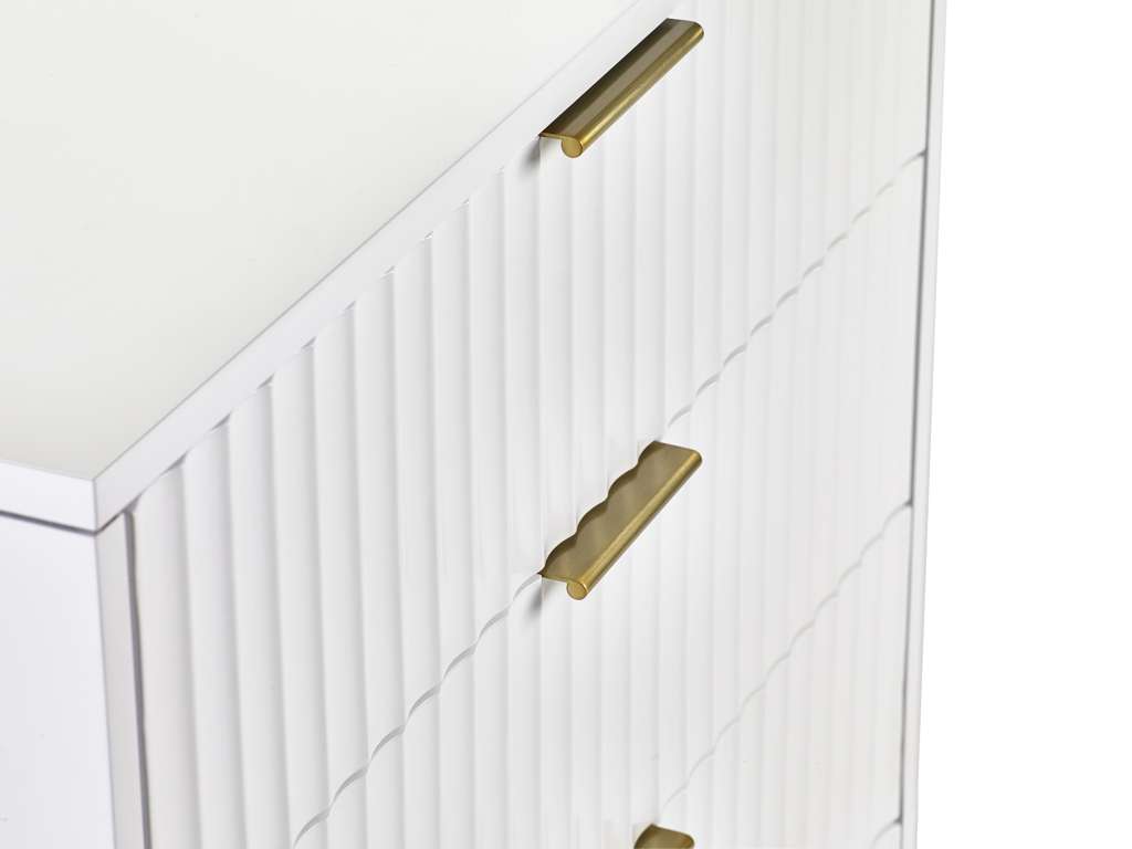 Sculpted fronts are a look that you do NOT want to miss out on. Murano is inspired by chic design â the brushed gold accents promote a high-end aesthetic that is on-trend but also perfect for various interior styles. How about pairing this collection with velvet sofas or bed to create the perfect feel for your home? This collection includes white finished bedroom pieces, and black finished living.