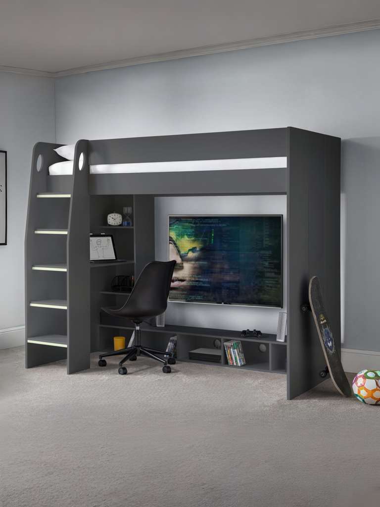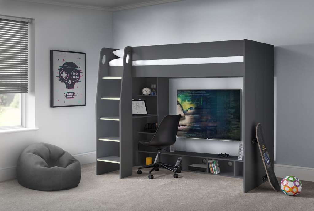 The Nebula offers the perfect set up for teenage gamers, with a large wall space for a TV, desk for a monitor and shelving for storing games, what more could you need? Finished in a choice of Anthracite, White or Grey Oak offering the perfect style for any bedroom, this modern gaming bed is sure to please. Offering somewhere to sleep, play and stream, this bed has it all.
