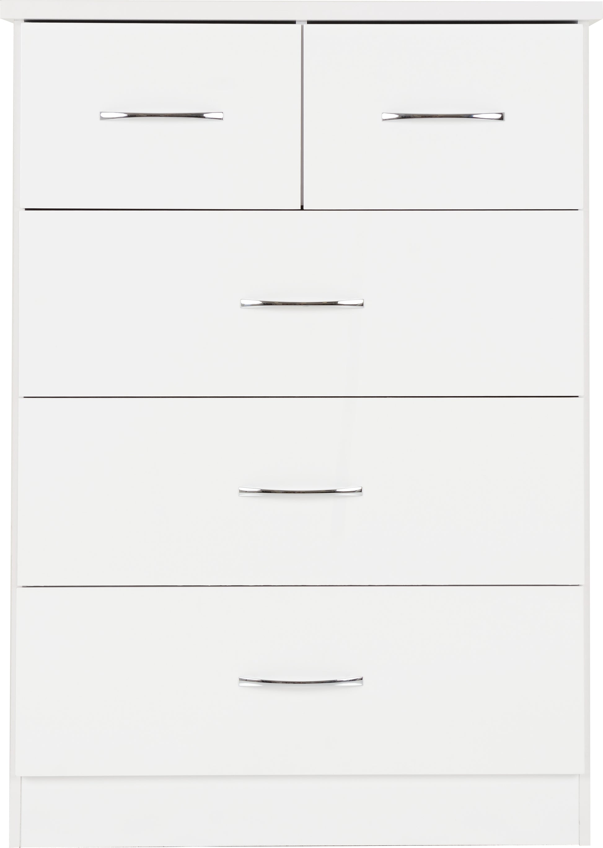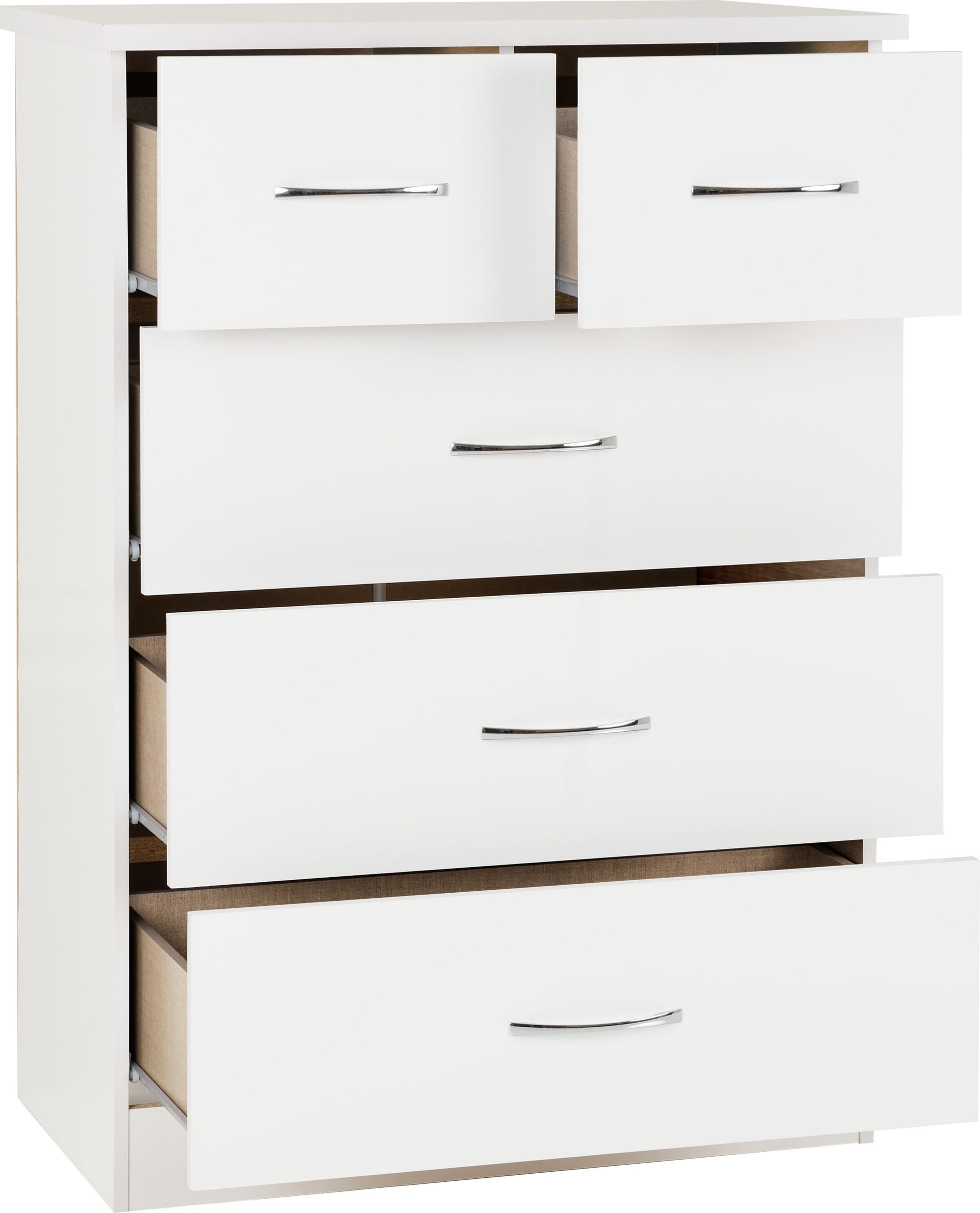 Make space feel calm and considered with the Nevada 3+2 Drawer Chest in a White Gloss. Everyday-friendly and tidy, it offers three drawers and two doors you'll use from day one. Clean lines and a durable build make it an easy fit in both modern and classic rooms.