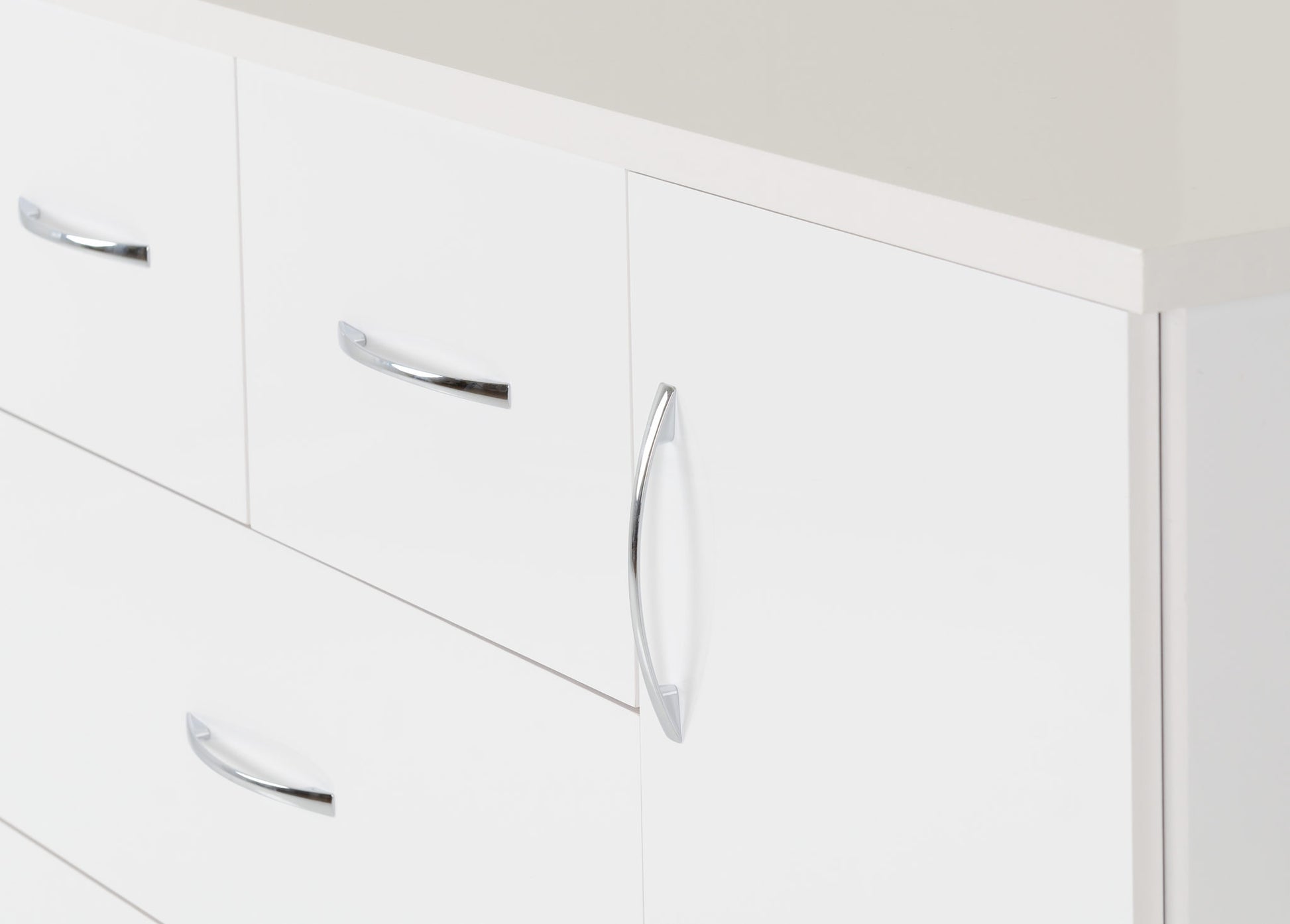 Make space feel calm and considered with the Nevada 5 Drawer Low Wardrobe finished in White Gloss. Practical and good-looking, it delivers plenty of room to keep everything organised without the fuss. Clean lines and a durable build make it an easy fit in both modern and classic rooms.