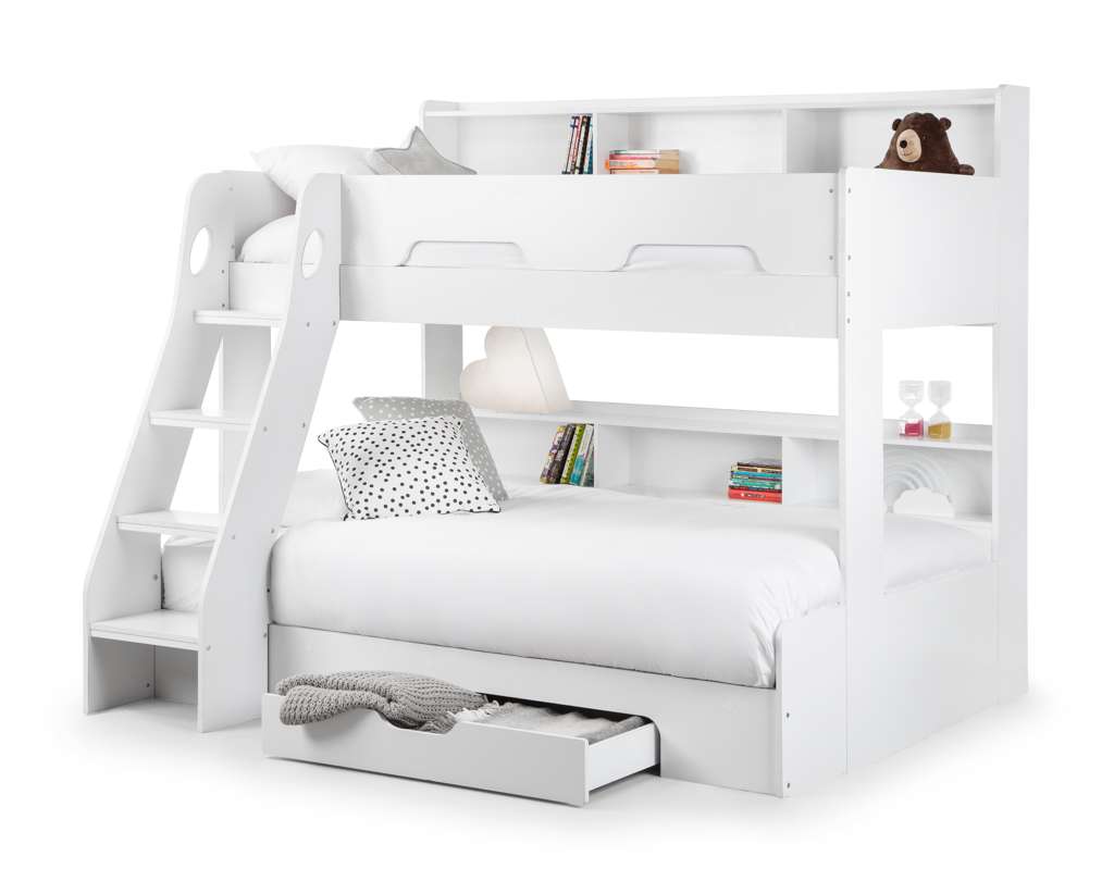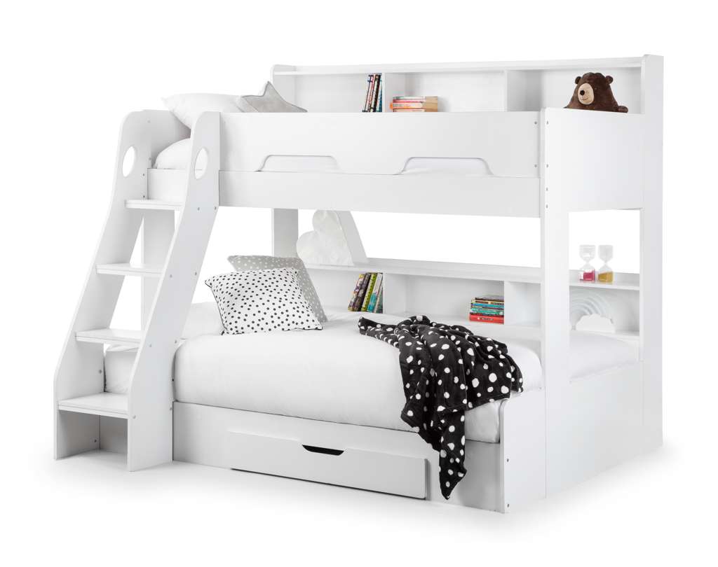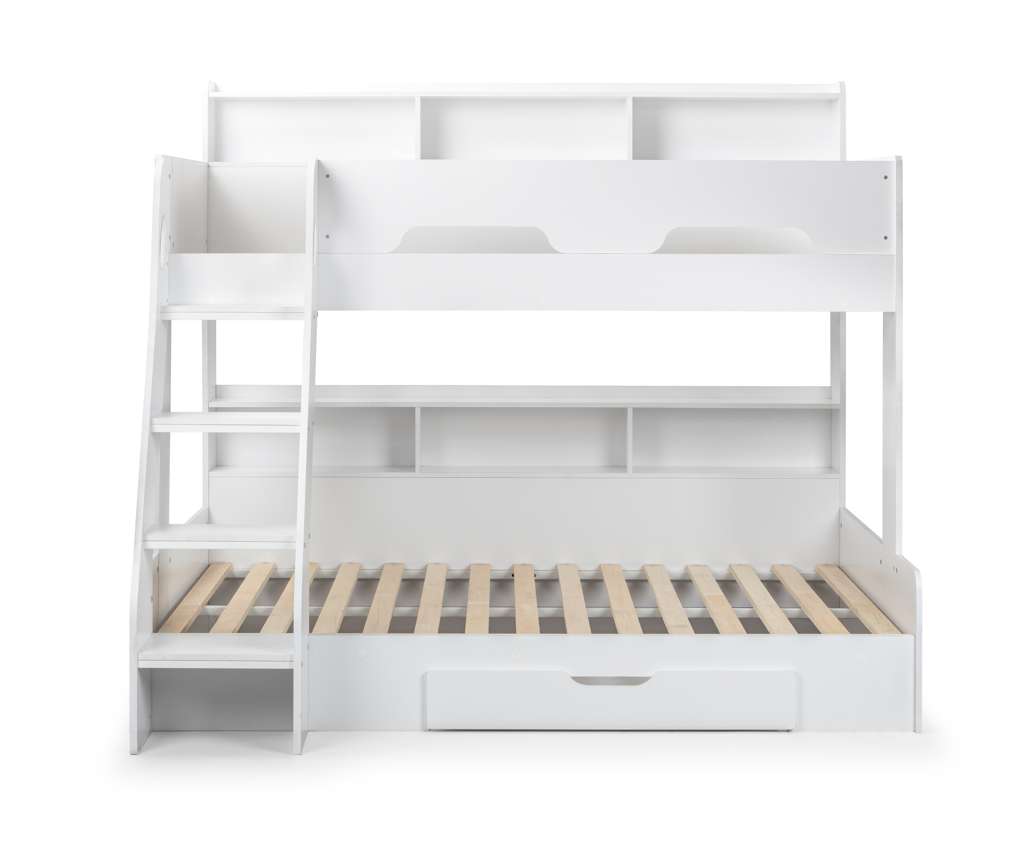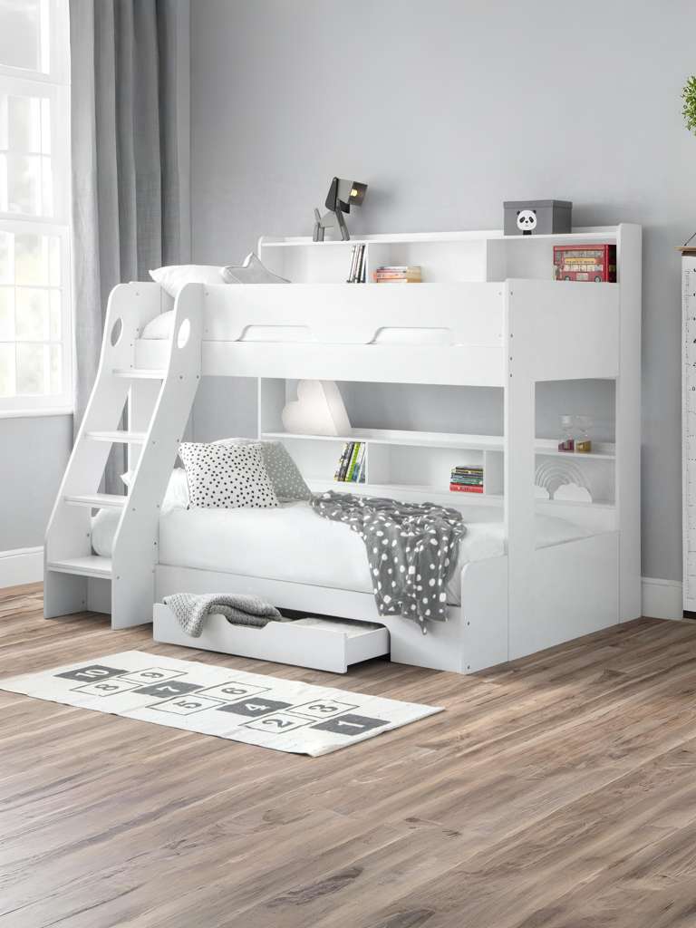 The Orion Triple Bunk is available in a modern Anthracite or White finish and combines contemporary style with clever functionality. Designed with a single bed on the top bunk and a small double on the bottom, it comfortably sleeps up to three childrenâor adults if used as a guest bed. Practical features include a handy pull-out drawer and generous shelving space for books, toys, and other essentials, all with a raised lip to prevent items from slipping behind. The sturdy ladder features stylish cut-out handles and optional glow-in-the-dark strips on the steps for added safety and ease of use.