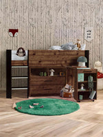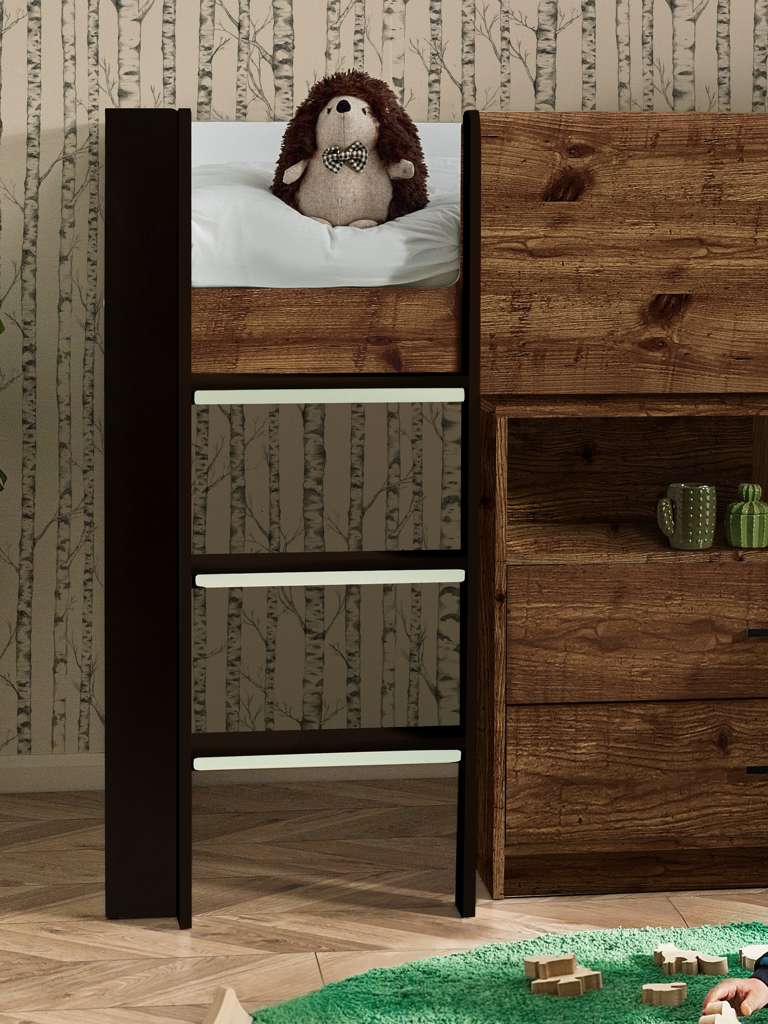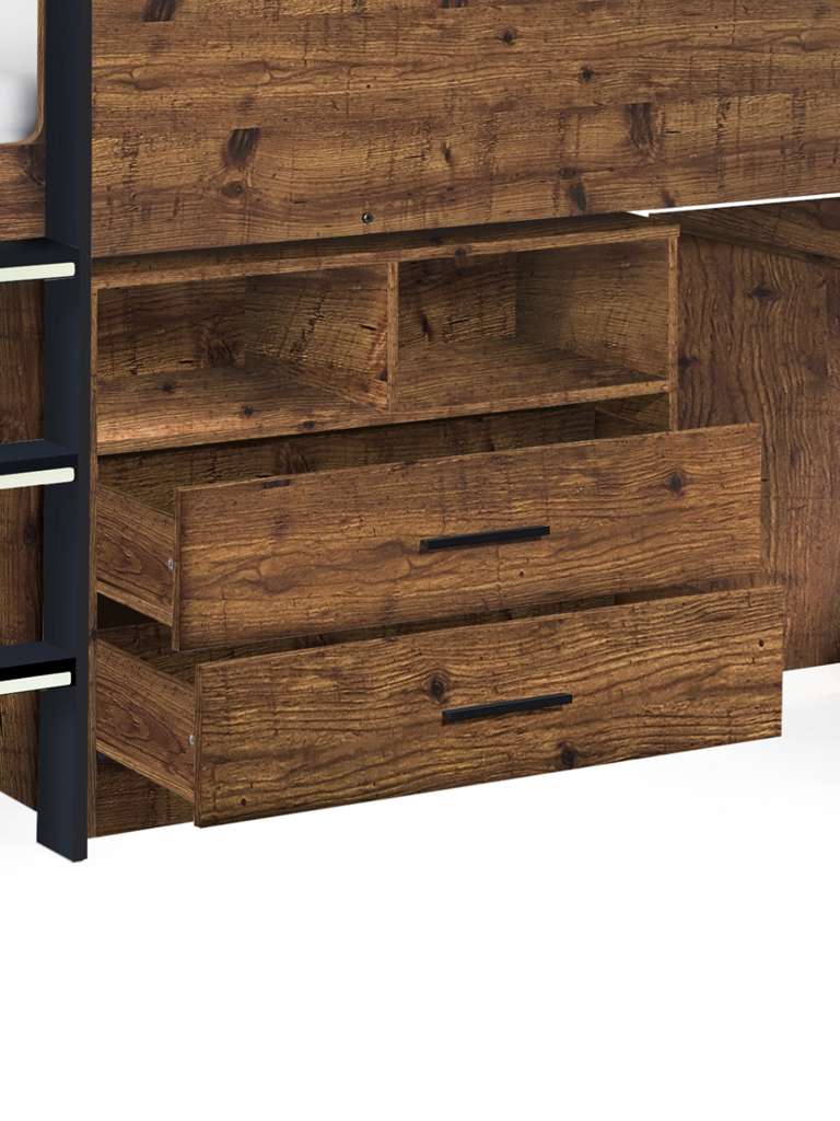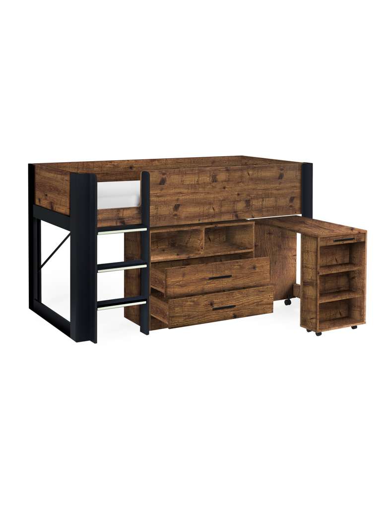 Embark on a bedtime adventure with the Otis Midsleeper, a versatile and stylish addition that transforms your child's room into a haven of imagination. The urban rustic wood and black finish add a touch of modernity. Featuring two pull-out drawers with handles for convenient storage and shelving underneath for toys and essentials, this midsleeper is designed for practicality.The standout feature is the pull-out desk with wheels, providing a dedicated study space that can be effortlessly tucked away when not in use. Additional shelving ensures an organised and clutter-free environment for your little one. The three glow-in-the-dark steps add charm and safety, creating a playful and secure ascent to the cosy sleeping area.