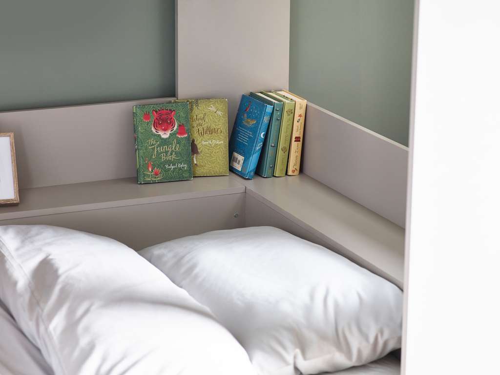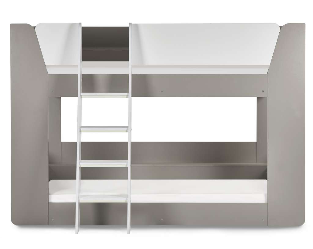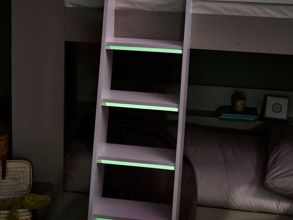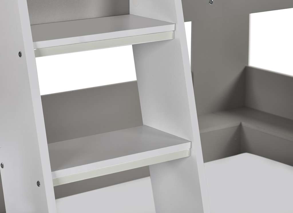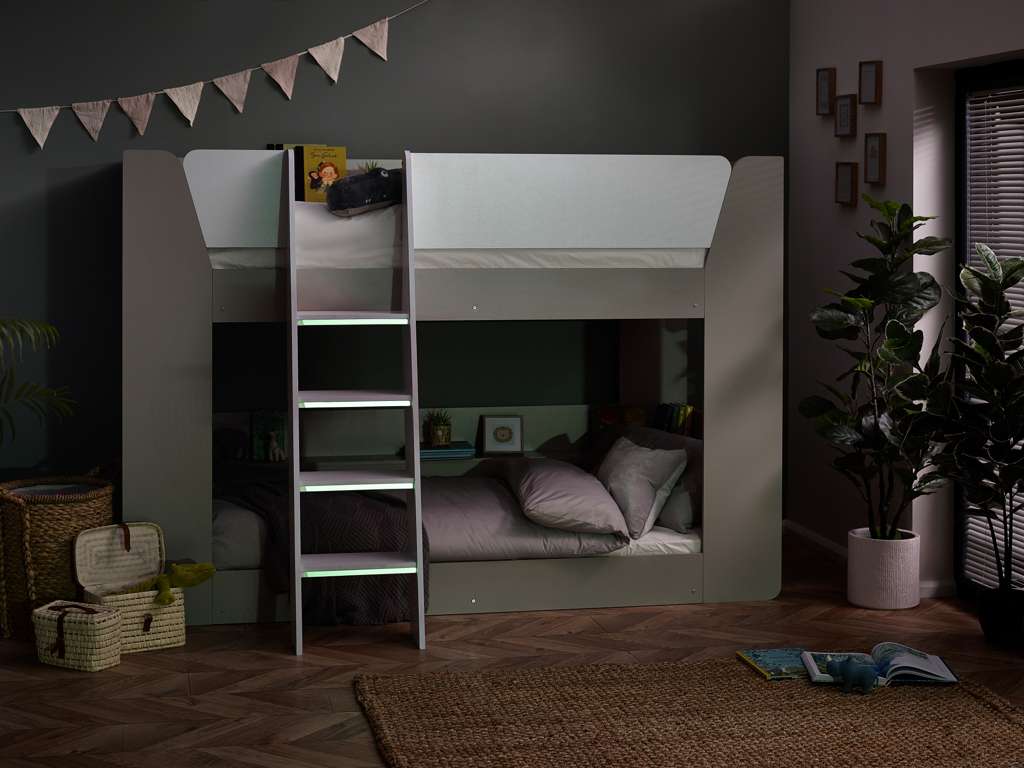 This gorgeous-designed, Parsec Bunk Bed is applicably constructed for convenience and durability. Features sturdy Taupe and white construction with a robust angled ladder including glow-in-dark steps. Making it an enchanting option for little ones.