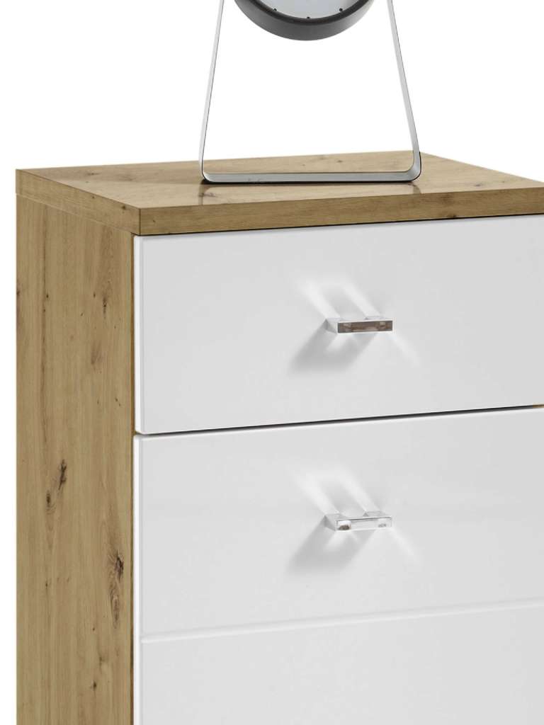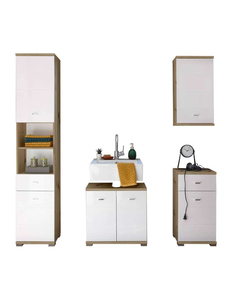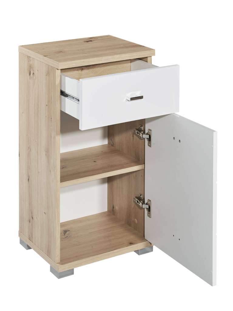The Pool Storage Cabinet is a stylish storage solution crafted from Artisan Oak with a glossy white front and sleek lined notch detailing. Featuring one spacious cupboard with two shelves and a convenient pull-out drawer, this cabinet offers plenty of room to organise your toiletries, towels, and other essentials. The silver handle complements its modern aesthetic, ensuring both elegance and ease of use. This cabinet blends ample storage with contemporary design, bringing both style and order to your bathroom.