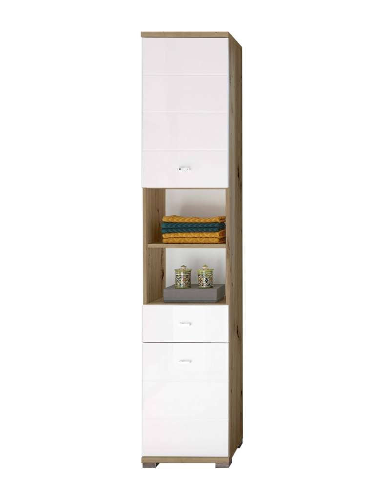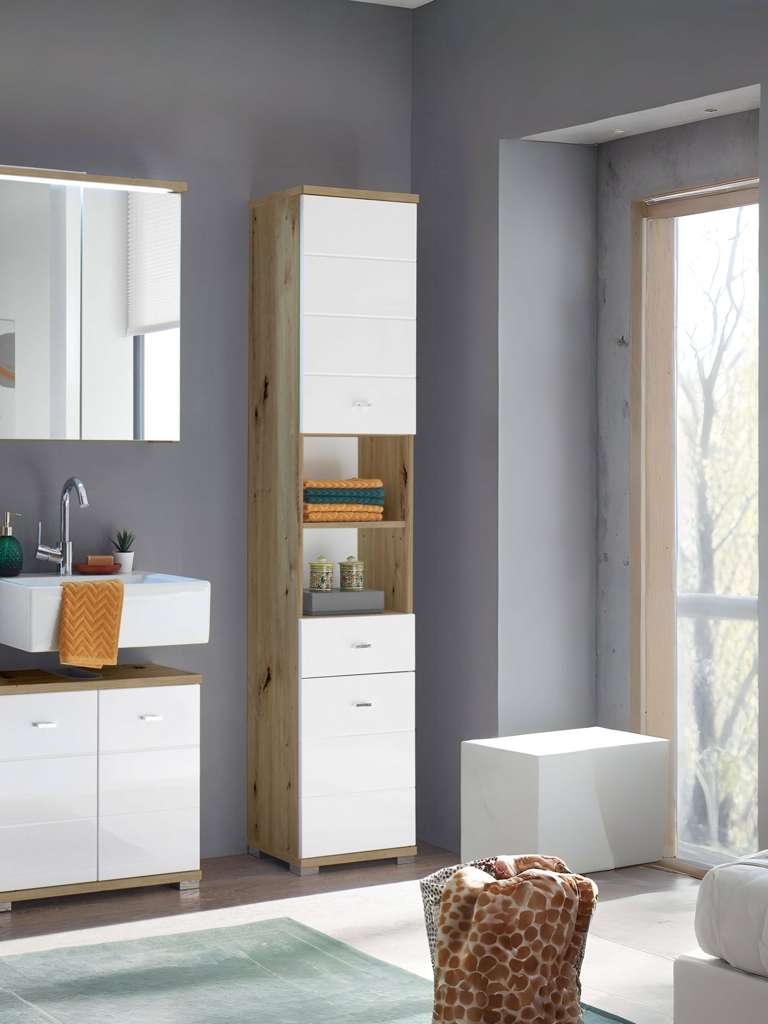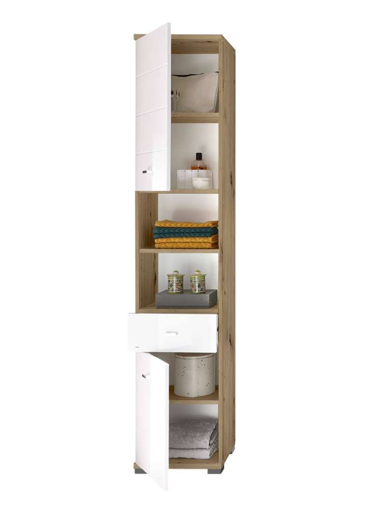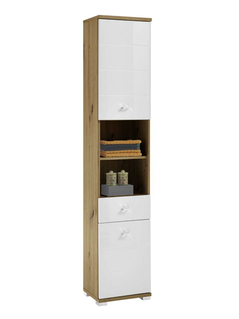 The Pool Cabinet offers a perfect mix of storage and display options for your bathroom. Made from Artisan Oak with a striking white high gloss front and a lined notch design, it brings a modern, sophisticated touch to any space. With two cupboards and four shelves, it provides ample room for storing all your essentials. The two open middle compartments create a beautiful space to showcase decorative items or neatly folded towels, while the pull-out drawer adds extra functionality. Finished with sleek silver handles, this cabinet combines beauty and practicality, making it ideal for any bathroom.