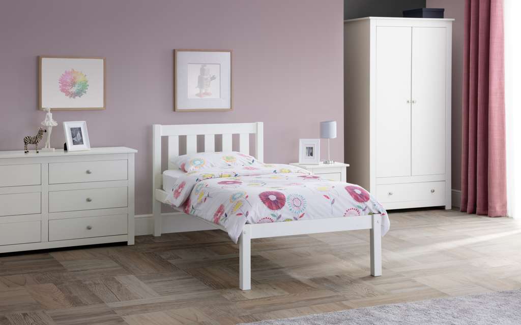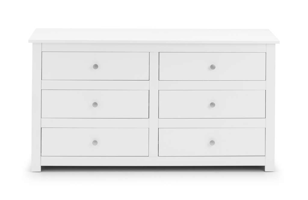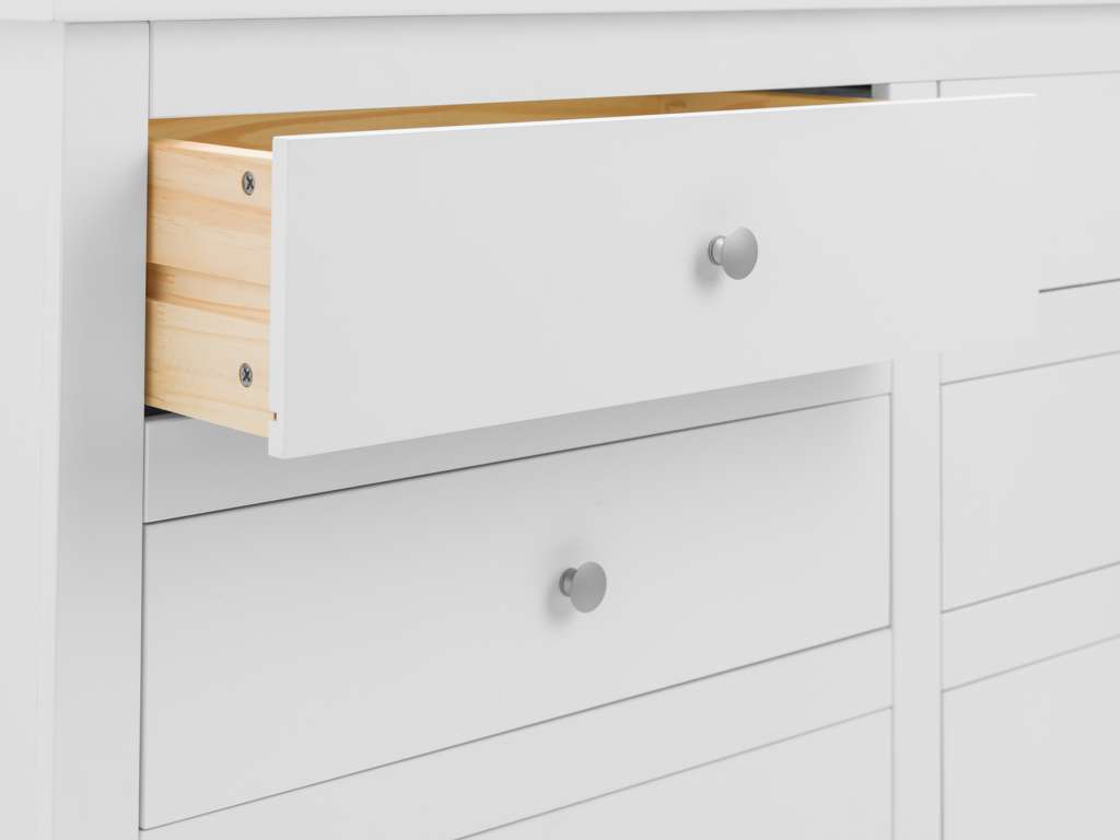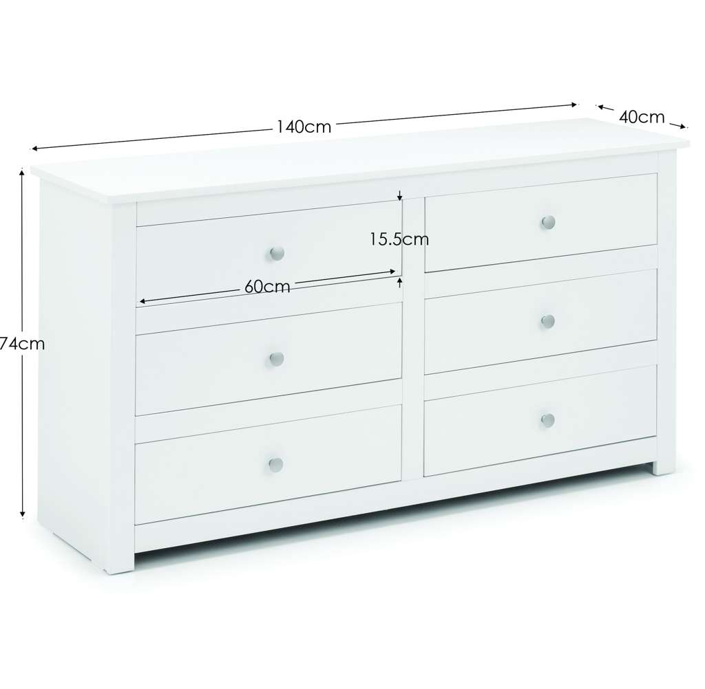 Boasting clean, simple lines the Radley 6 drawer chest is perfectly suited for both modern or traditional styles. Featuring six generously sized drawers, to keep your bedroom neat and tidy. Finished in a surf white lacquer, with delicate silver handles, the Radley Bedroom Collection is perfect for adult and kids bedrooms.
