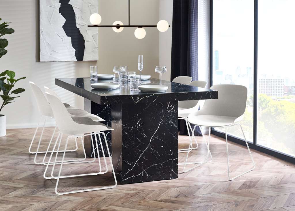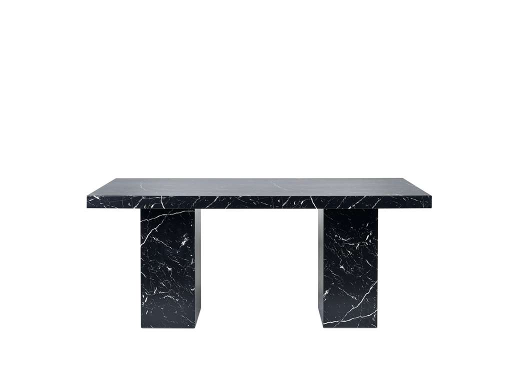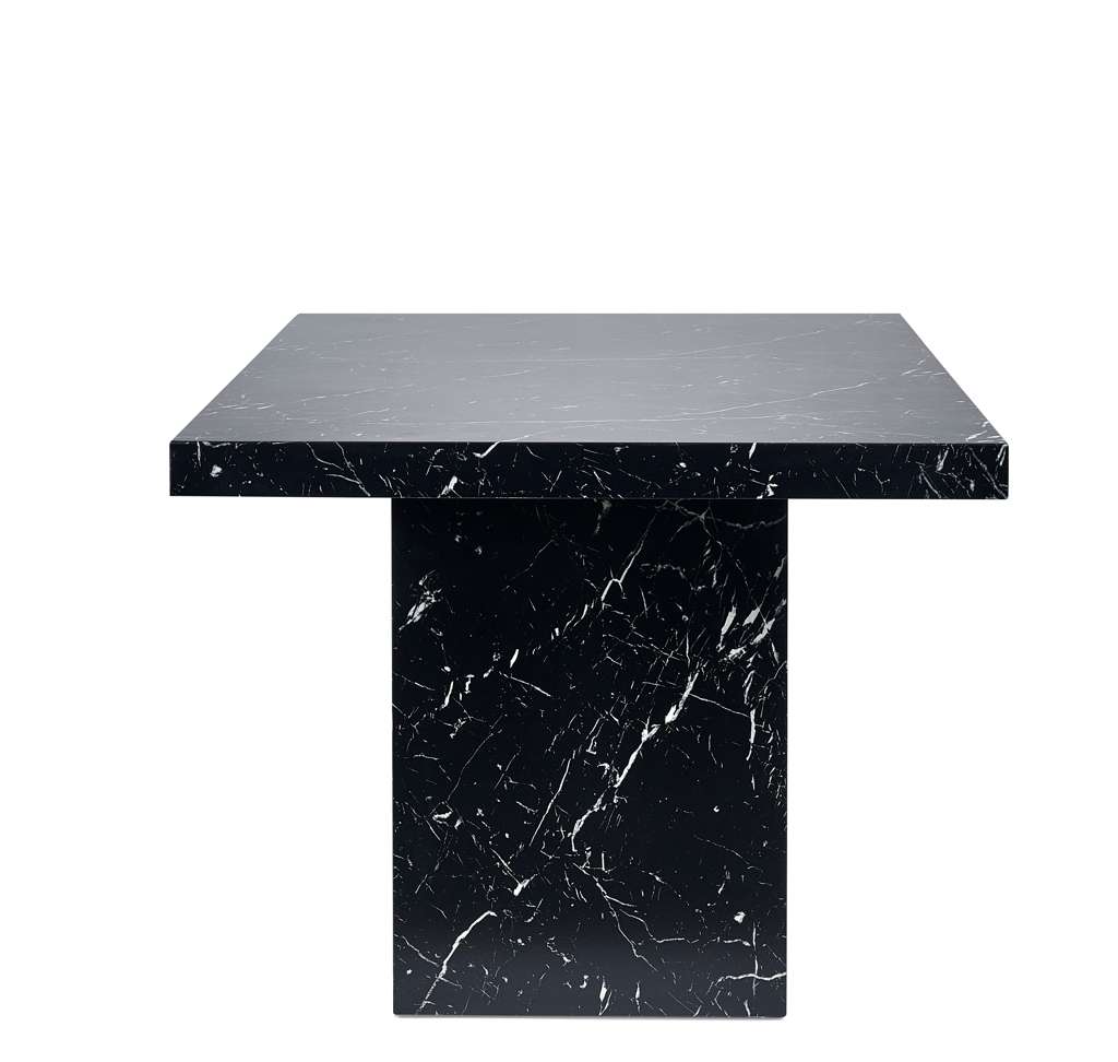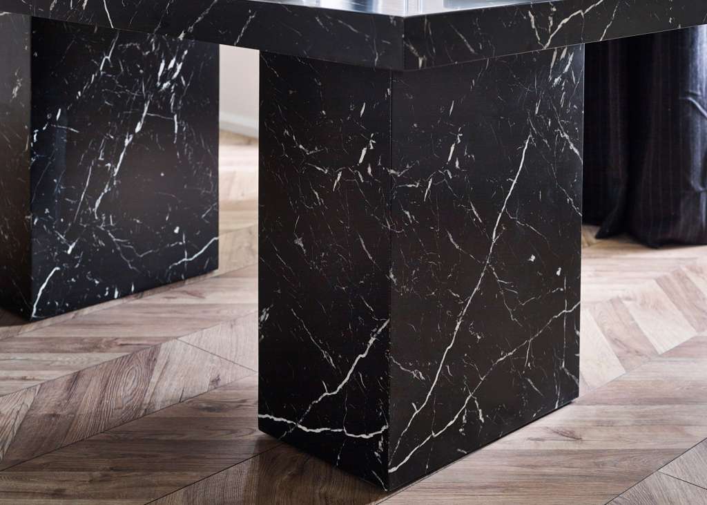 Introducing the Rome black marble effect table with pedestal legs â a striking fusion of timeless elegance and contemporary design. Elevate your dining experience with this exquisite piece that effortlessly combines the sophistication of white marble with the modern flair of pedestal legs. The expansive tabletop, featuring a stunning marble effect in crisp black tones, creates an instant focal point in your dining space. The realistic marble pattern adds a touch of luxury and refinement, making this table a statement piece that complements a range of interior styles.