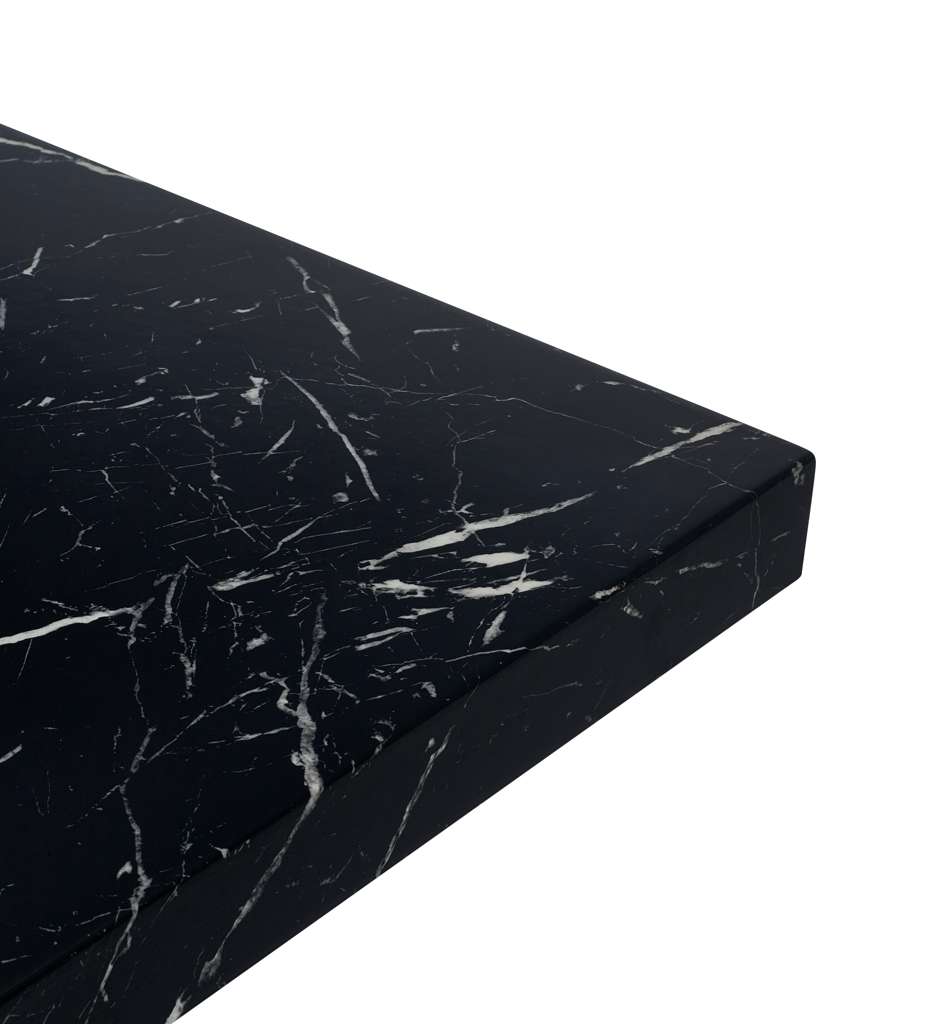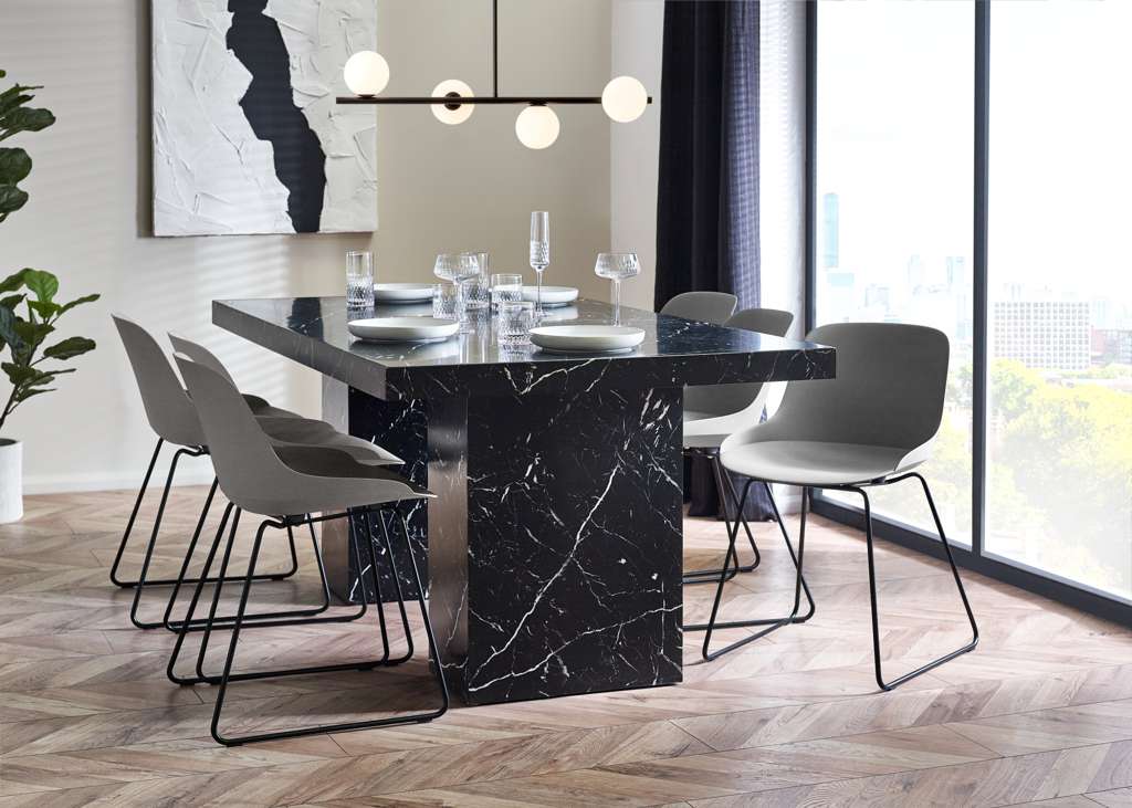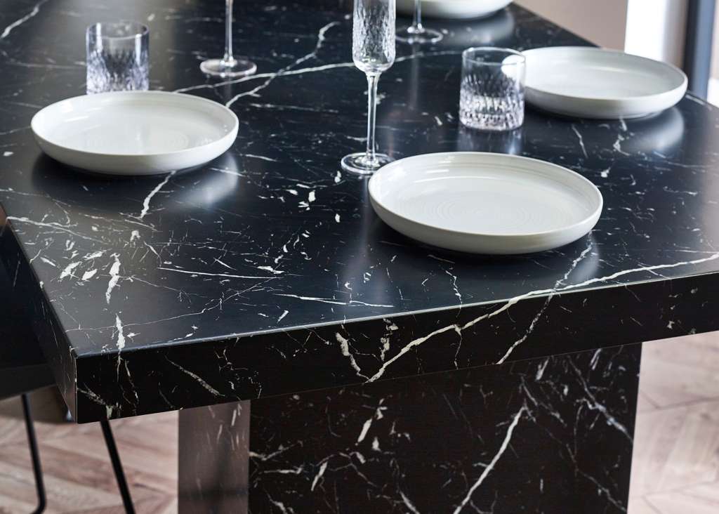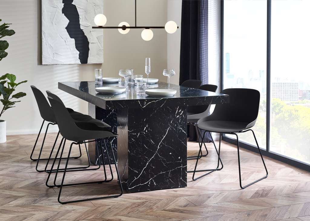 Introducing the Rome black marble effect table with pedestal legs â a striking fusion of timeless elegance and contemporary design. Elevate your dining experience with this exquisite piece that effortlessly combines the sophistication of white marble with the modern flair of pedestal legs. The expansive tabletop, featuring a stunning marble effect in crisp black tones, creates an instant focal point in your dining space. The realistic marble pattern adds a touch of luxury and refinement, making this table a statement piece that complements a range of interior styles.