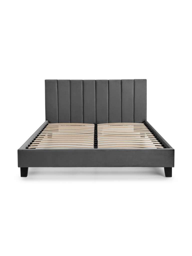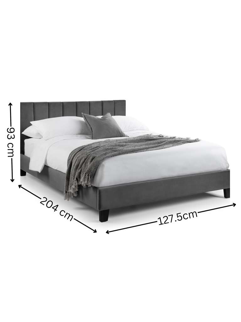 Step into comfort and style with the sophisticated charm of this upholstered bed. Wrapped in scrumptious grey velvet fabric, it adds a cosy yet refined texture to your space. The statement tall headboard features elegant vertical paneling that brings depth and subtle detail, making it a stylish focal point. Supported by sleek black legs and a low-profile frame, it combines contemporary design with everyday comfort. Easy to assemble with minimal steps. Mattress sold separately. Designed for standard 120cm small double mattresses.