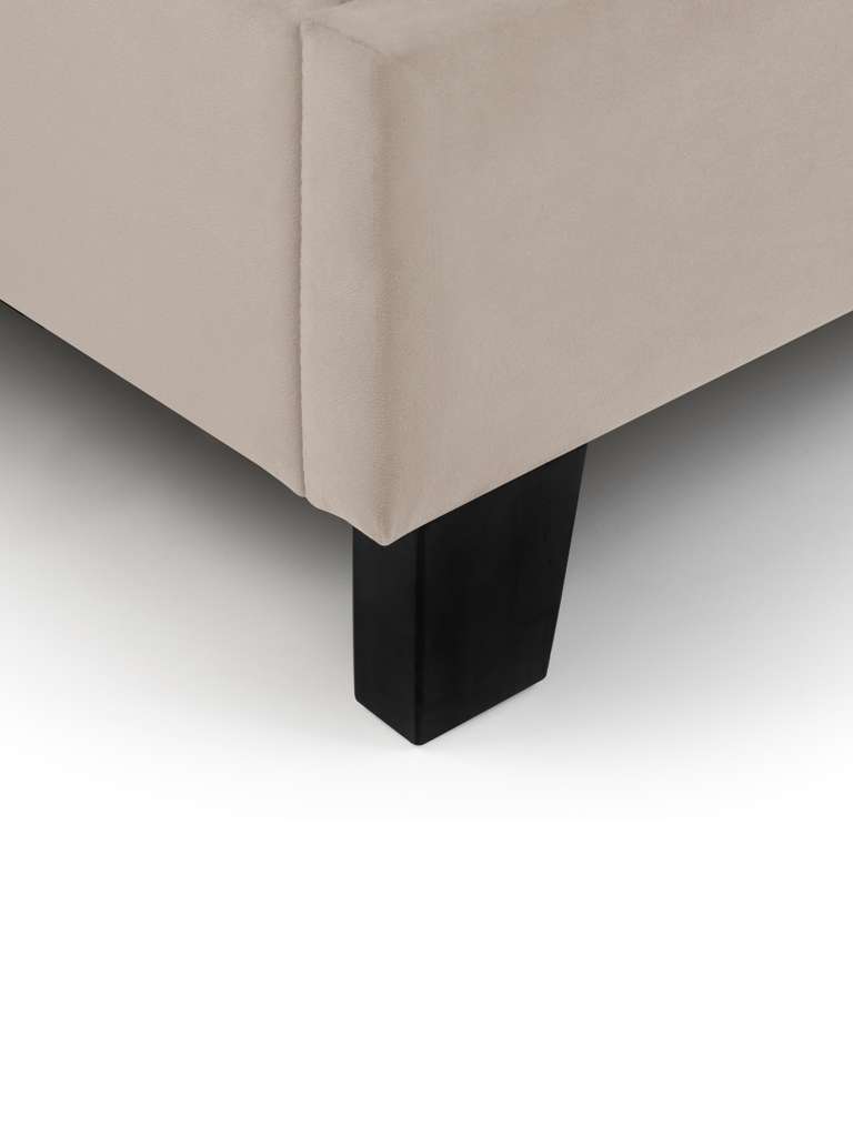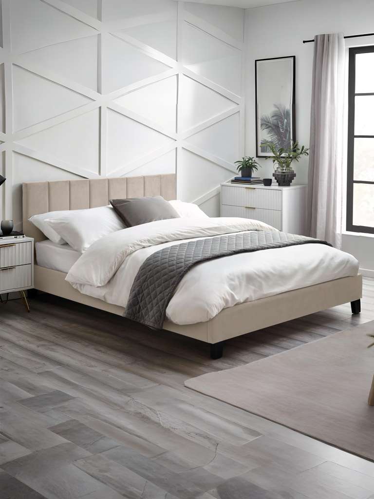Transform your bedroom into a serene and stylish retreat with this elegant upholstered bed. Wrapped in smooth cream velvet fabric, it brings a soft, luxurious feel to any space. The tall headboard is enhanced by refined vertical paneling, bringing a sense of sophistication and subtle detail. Finished with a low-profile frame and sleek black legs, this fabric bed perfectly balances comfort and modern simplicity, making it ideal for everyday living. Minimal assembly required. Mattress sold separately. Compatible with standard king mattresses (150cm).