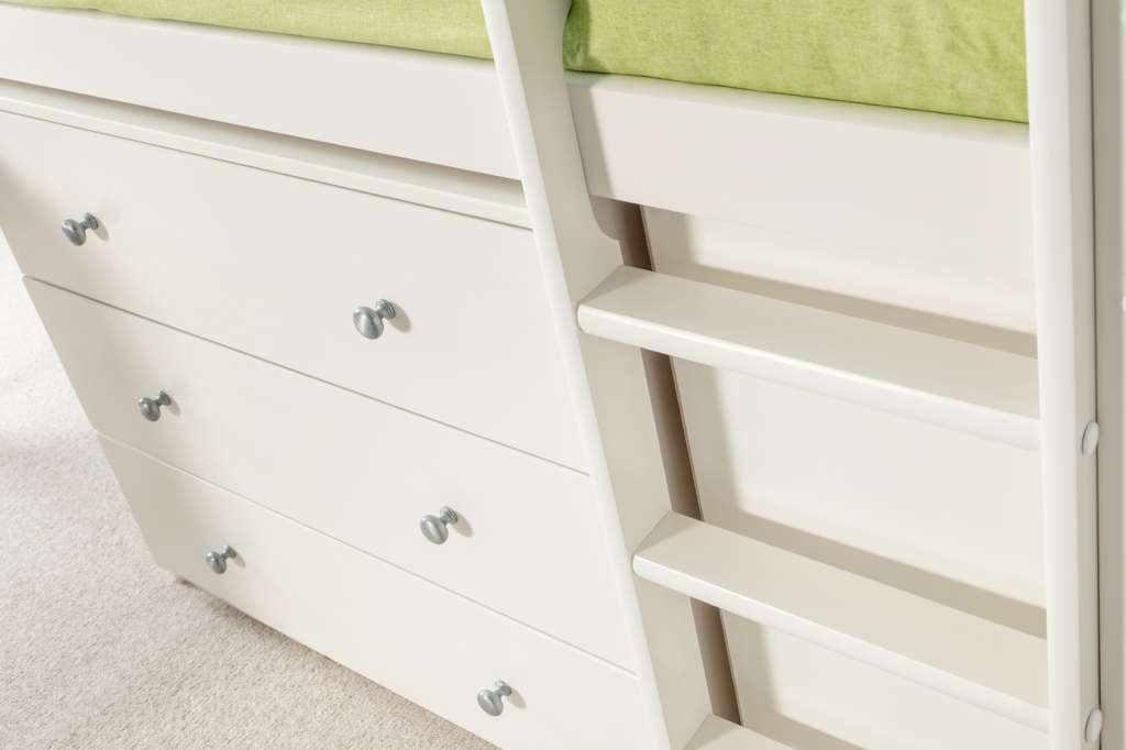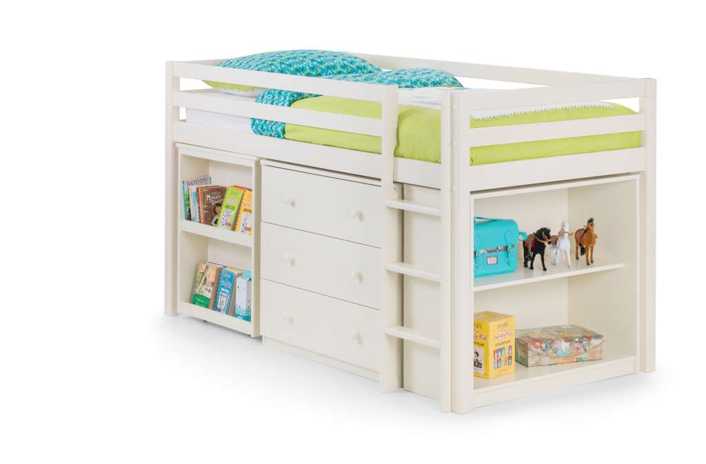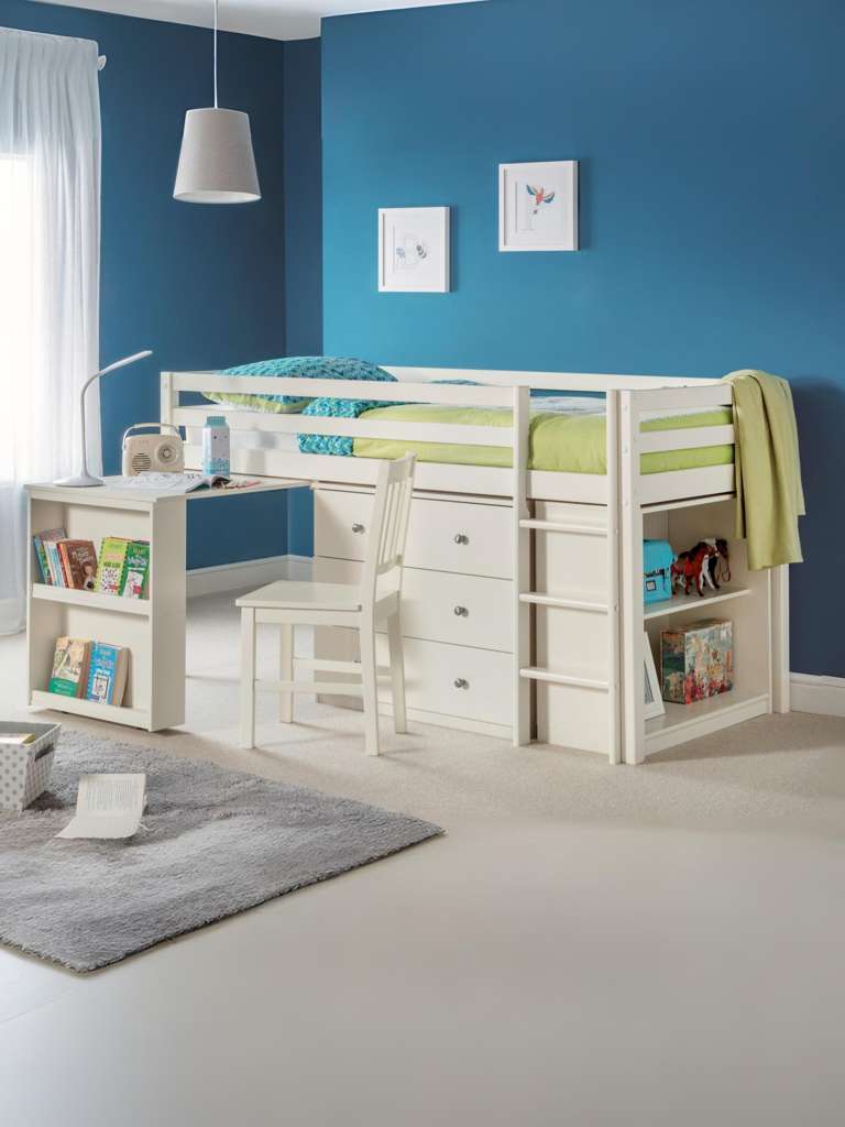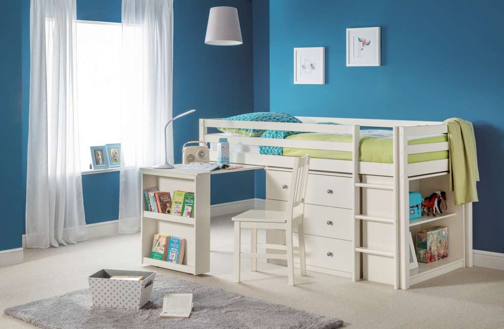 Roxy is an extremely clever and practical piece of children's furniture that offers incredible functionality and great value for money. Roxy's compact footprint is supported by a robust, solid pine framed construction and offers numerous useful features from a handy pull-out desk to ample shelving and cupboard space. Immaculately finished in a smooth stone white lacquer, Roxy comes with two choices of handle in either traditional painted wood, or a contemporary brushed steel finish. Roxy is the perfect accompaniment to Julian Bowen's Cameo range of bedroom furniture in a matching stone white finish. Roxy is also available in Dove Grey
