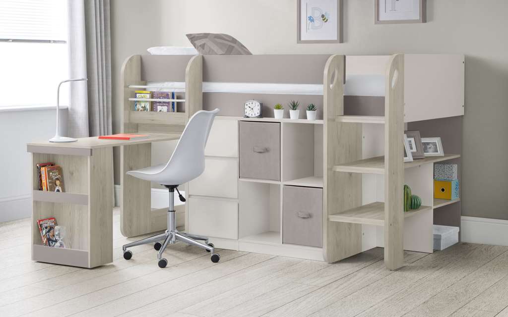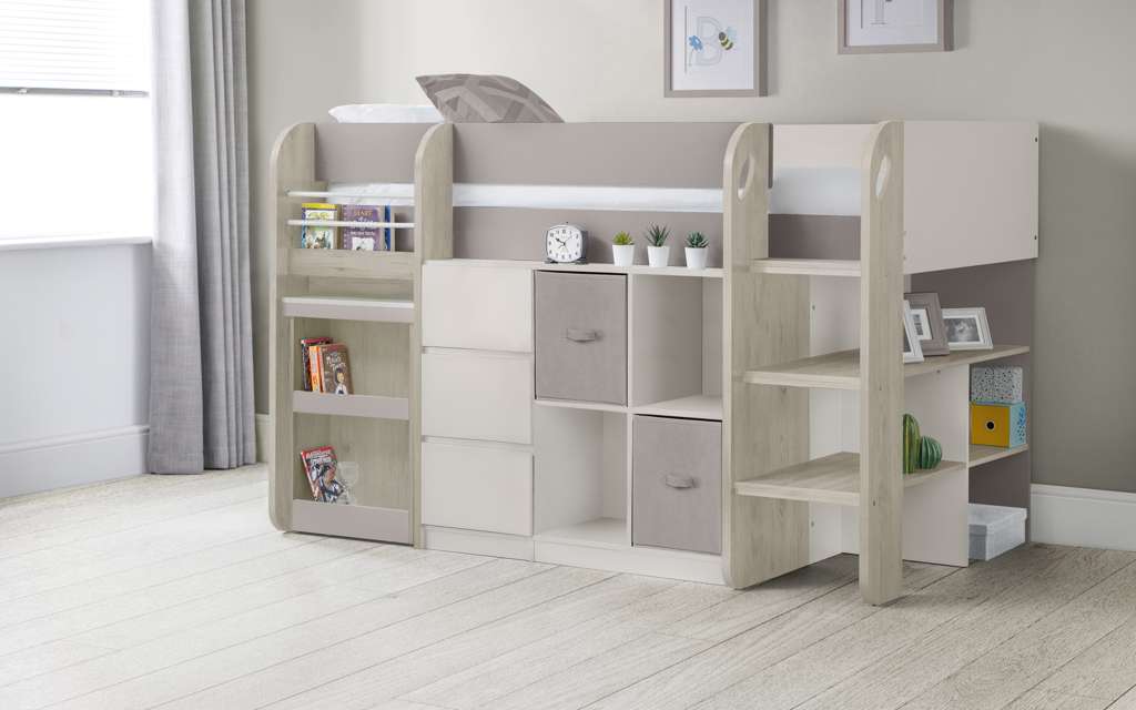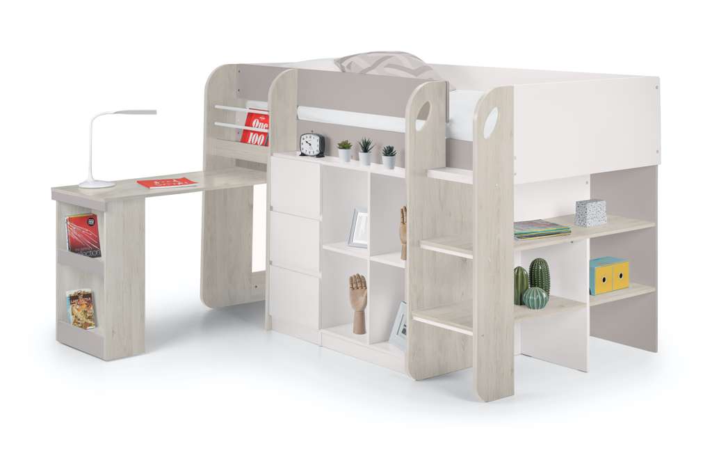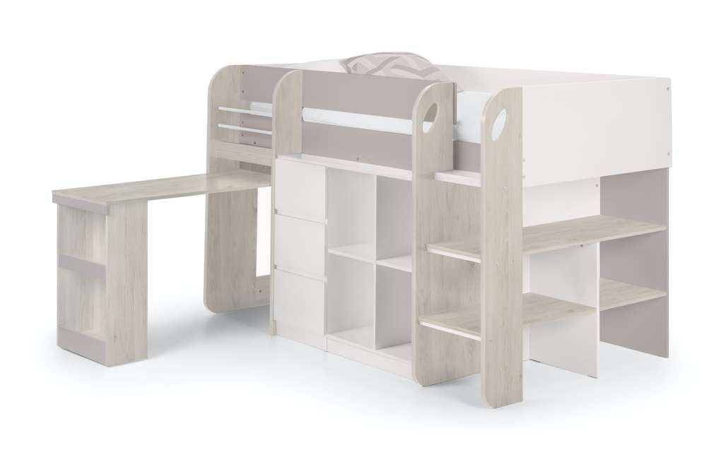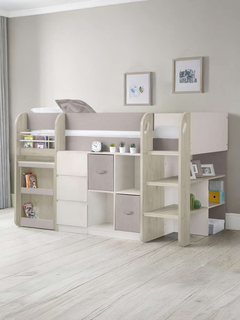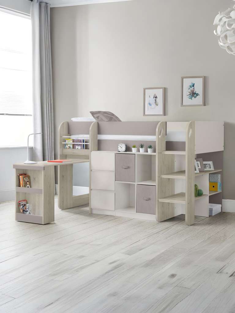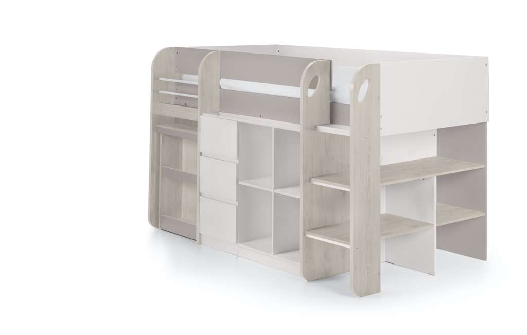 Offering a compact, space saving design, the Saturn Midsleeper features a bookcase, 3 drawer chest, and a cube bookcase saving floor space for toys and more. Finished in a modern taupe, this Midsleeper is perfect for a wide range of children's bedroom décor. Crafted from sturdy particleboard, this bed has a wooden slatted base and fits a UK single mattress.