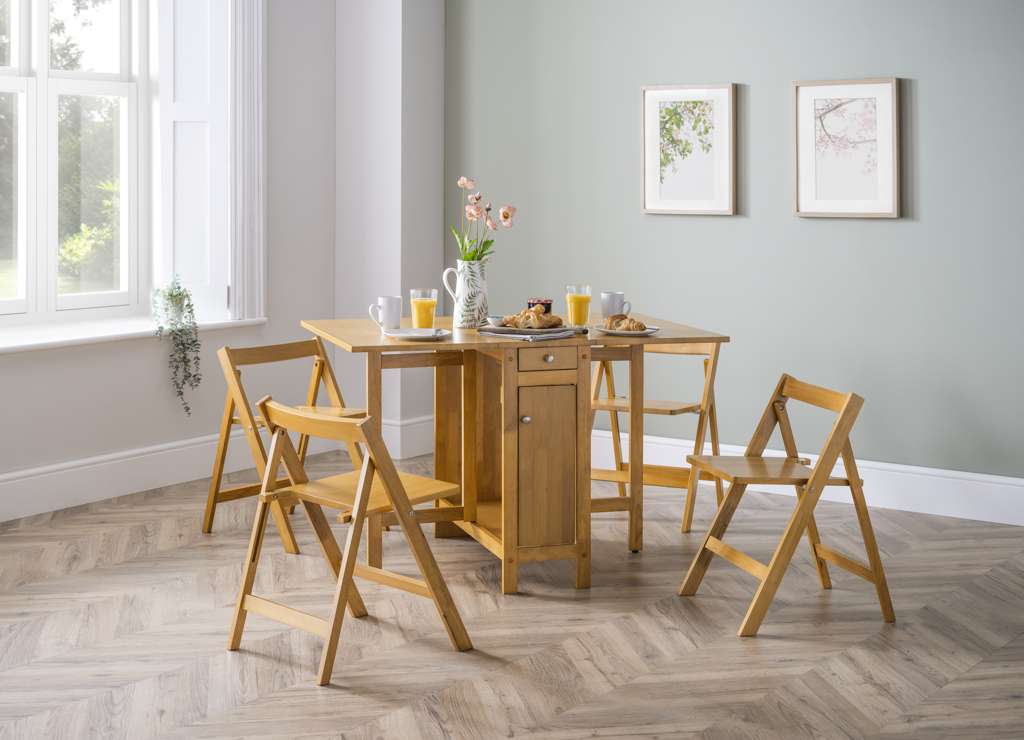 A neat and functional, space saving dining set where the chairs can be folded and stored Inside the table. This dining set is a timeless classic that features a integrated storage drawer, perfect for small spaces with less storage. Available in a light grey, white and natural, or an all over light oak finish.