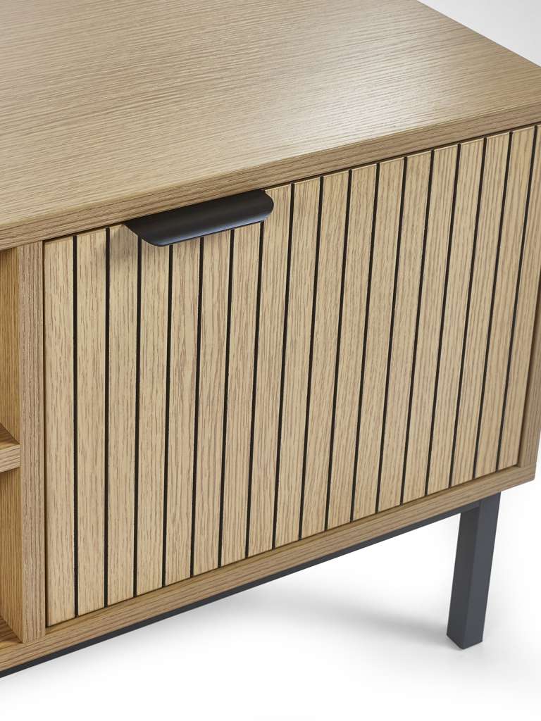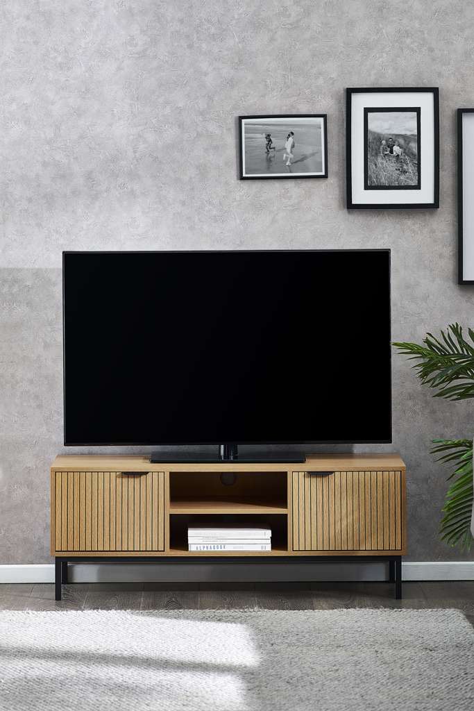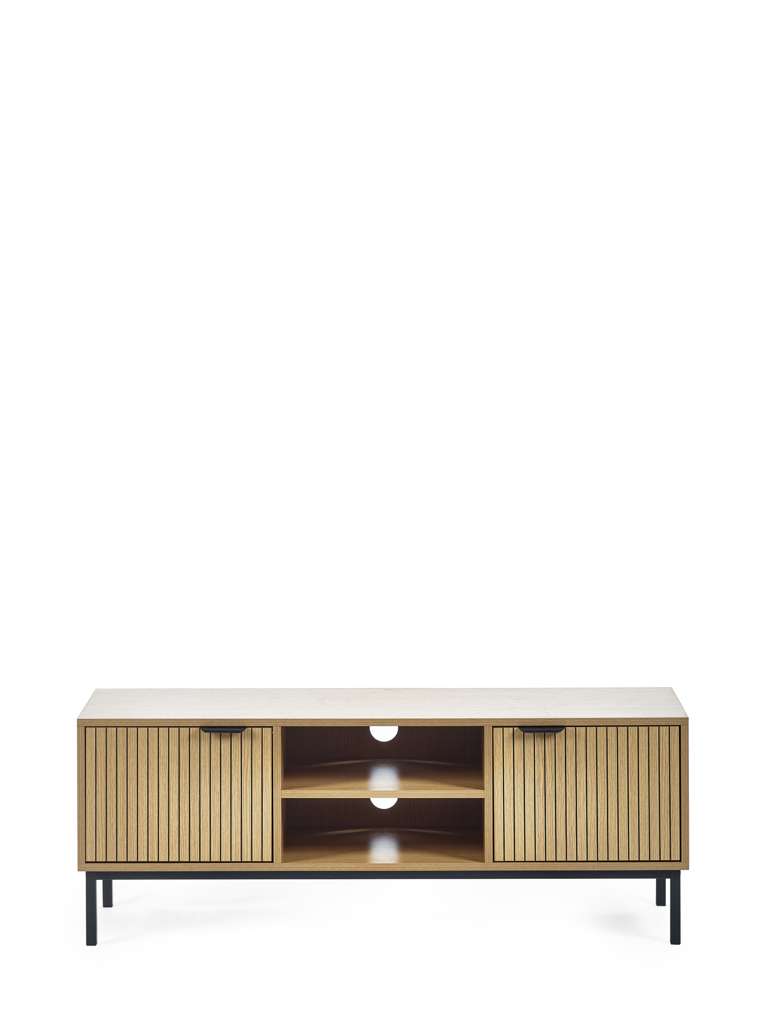 Revamp your living room with the Sia Media Unit, where style meets functionality. This chic media unit is designed to be the focal point of your space, featuring eye-catching slatted effect wood doors that seamlessly blend aesthetics with practicality. With spacious cabinets for all your media devices and an open middle shelf ideal for displaying your favorite decor or tech, this unit offers both style and convenience. Its sleek design, paired with a warm wood finish and sturdy black metal legs, brings a modern vibe that complements any interior, making your entertainment area both stylish and clutter-free. Simple assembly ensures you can set it up in no time.