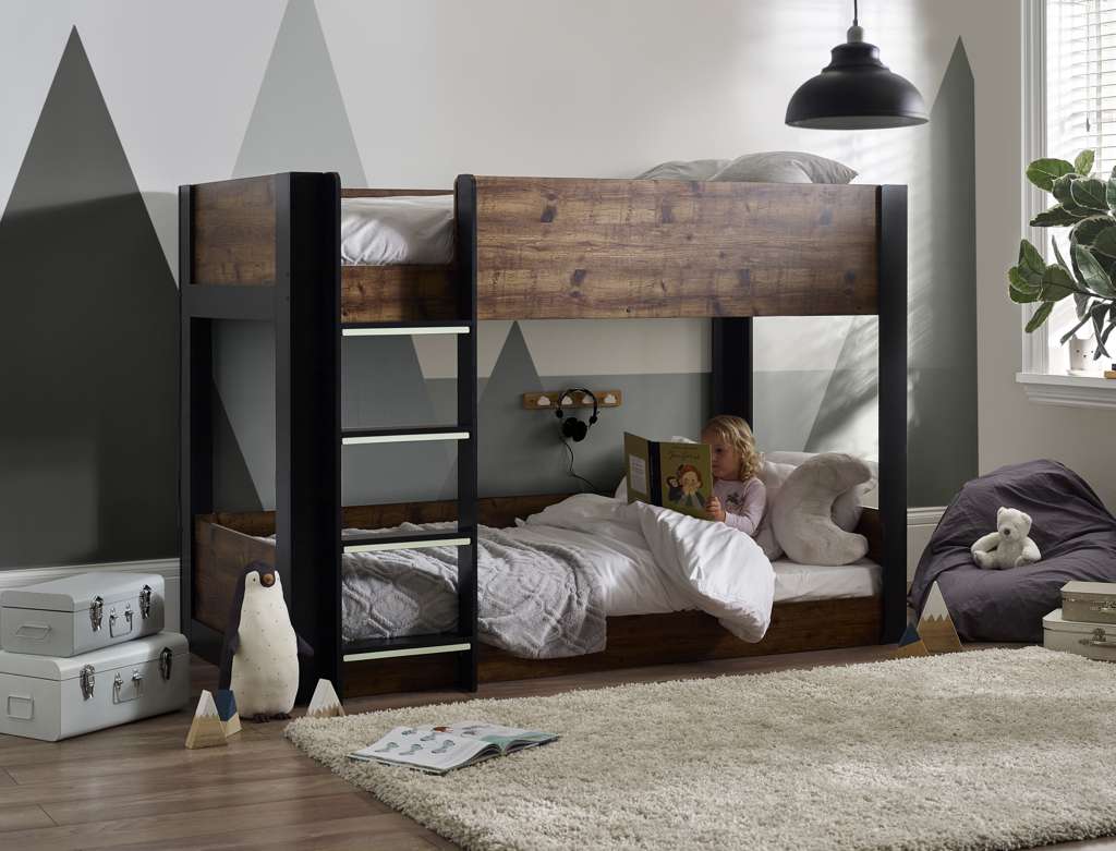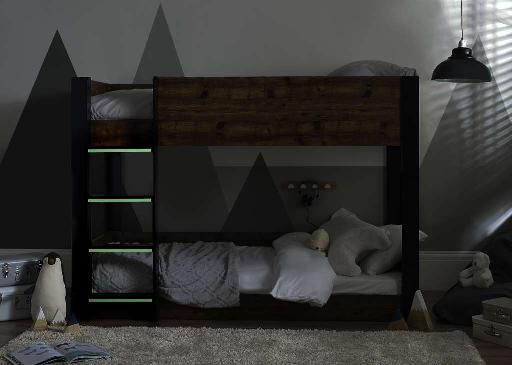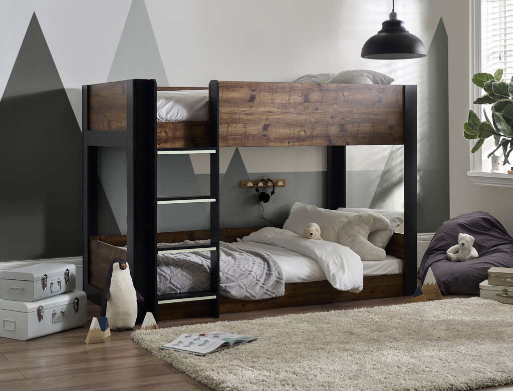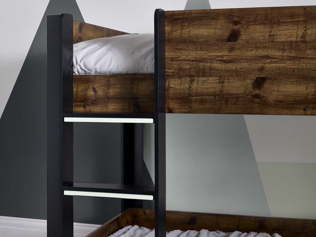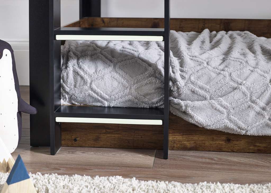 Transform bedtime into an enchanting adventure with the Solomon Bunk Bed, a cosy haven designed for style and safety. Finished in an urban rustic wood and black combination, this bunk bed seamlessly complements any decor, adding a touch of contemporary charm to your child's room. The highlight is the glow-in-the-dark steps, turning bedtime into a magical experience while ensuring safe access to the top bunk. Crafted with the well-being of your little ones in mind, the bunk bed features a boarded headboard and footboard, offering extra security and peace of mind
