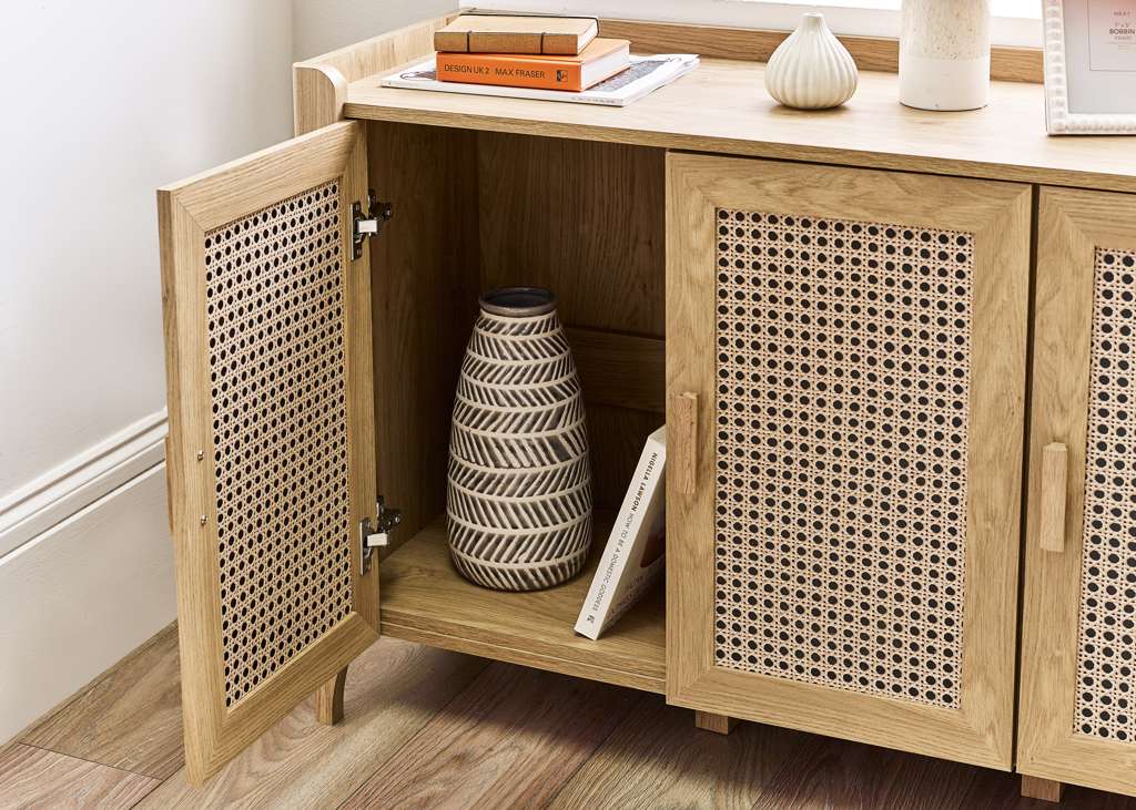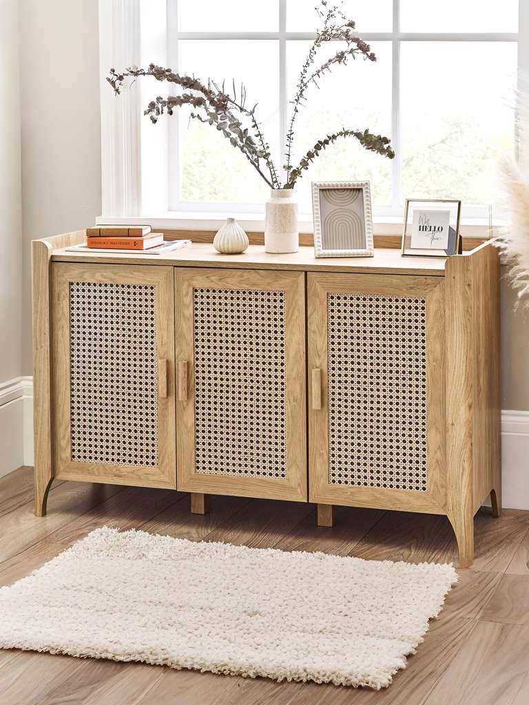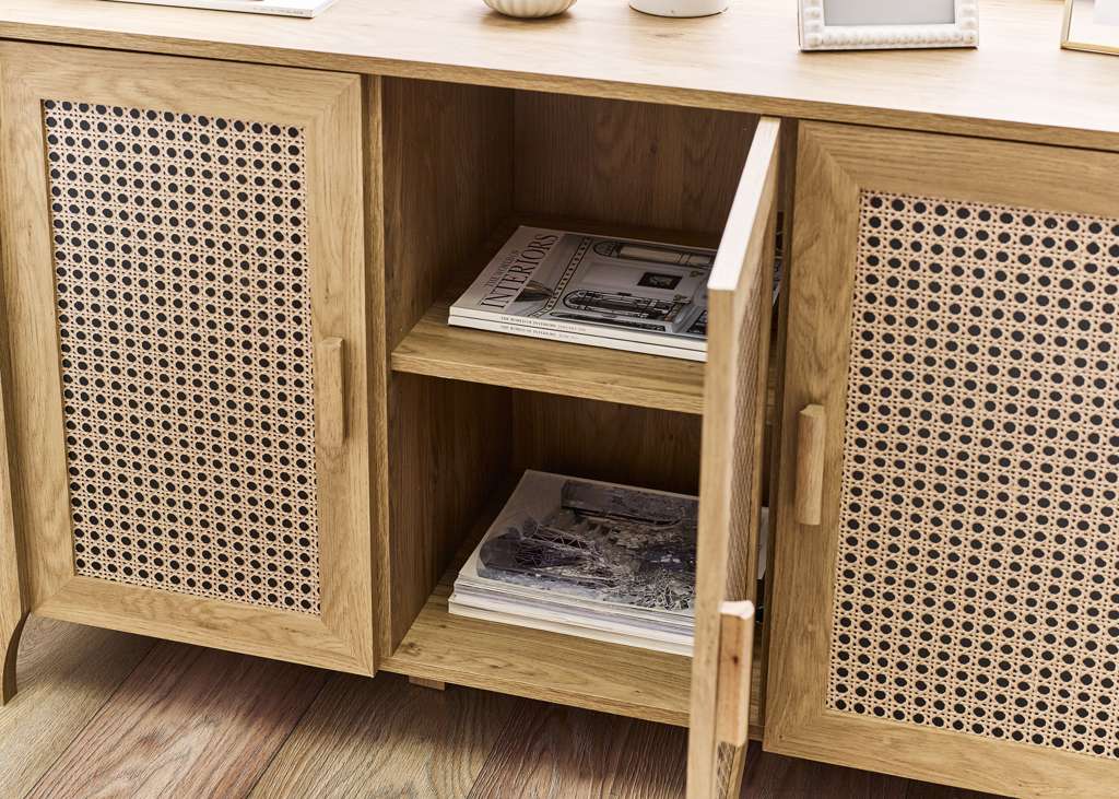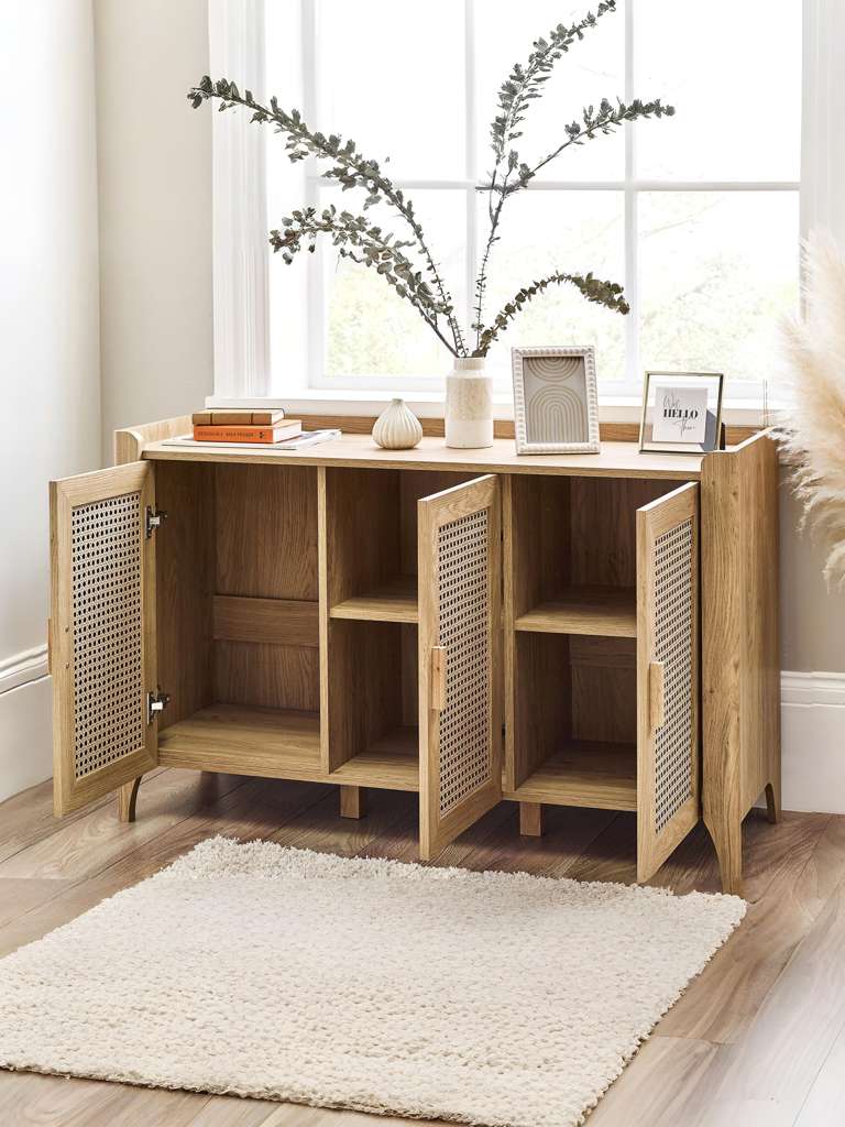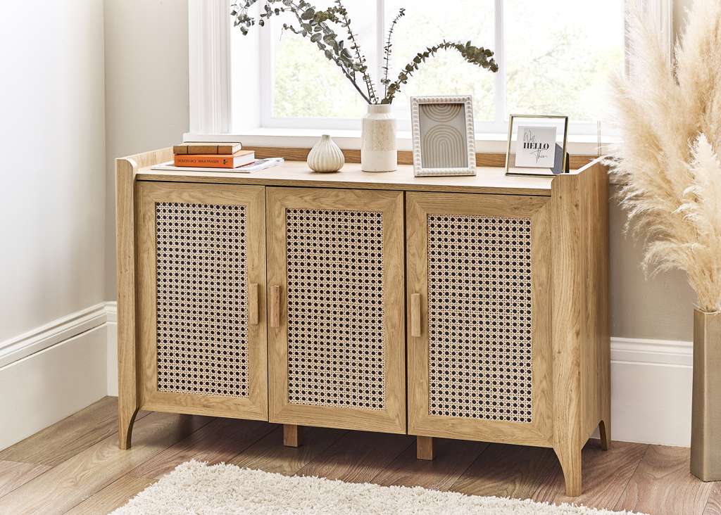 Showcasing a beautifully sleek design with a bohemian feel, the Sydney 3 Door Sideboard offers exquisitely curved edging accompanied by a raised lip around the edge providing a practical addition, stunningly combined with a rattan-effect sticker front. Finished with a natural oak effect featuring three cupboards with built-in shelving allowing you to store key necessities plus extra space on top to place ornaments. All around creating the perfect airy, warm feel within your home.