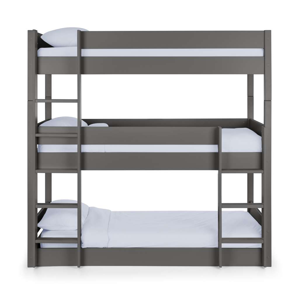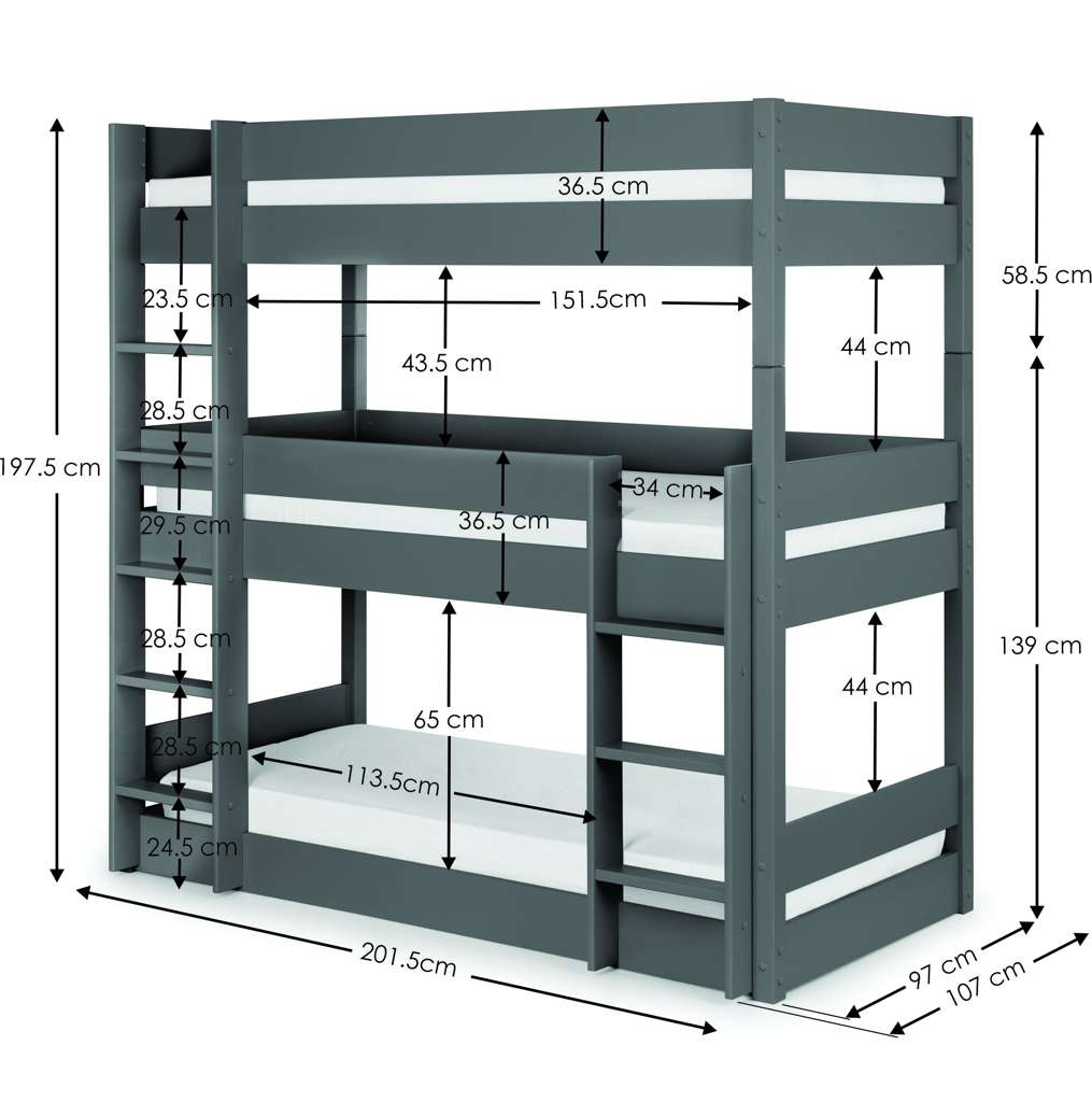 Accommodating 3 children whilst only using the space of one single bed, the Trio bunk bed is the perfect solution for those short on space in smaller bedrooms. Ideal for sleeping siblings, or regular sleepovers the durable Trio Bunk is finished in a stylish Surf anthracite, matching any bedroom decor. Crafted from solid pine and MDF, this safe and sturdy design is essential for maximising space.