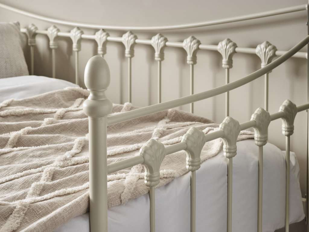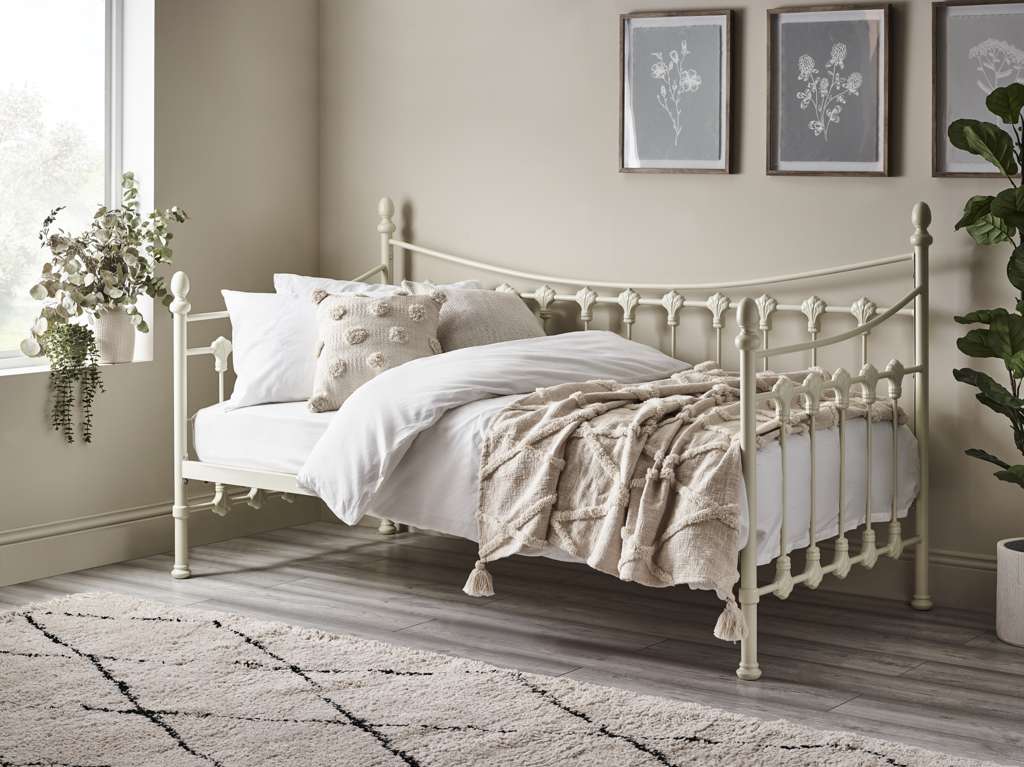 An elegant interpretation of a great classic design offering a full 90cm sleeping or sitting space. Finished in a stone white eggshell textured lacquer and incorporating a sprung slatted base for added comfort and prolonged mattress life. Versailles is a beautiful daybed that fits beautifully in any setting, from living room to conservatory, as a functional guest bed and even as a charming children's bed.