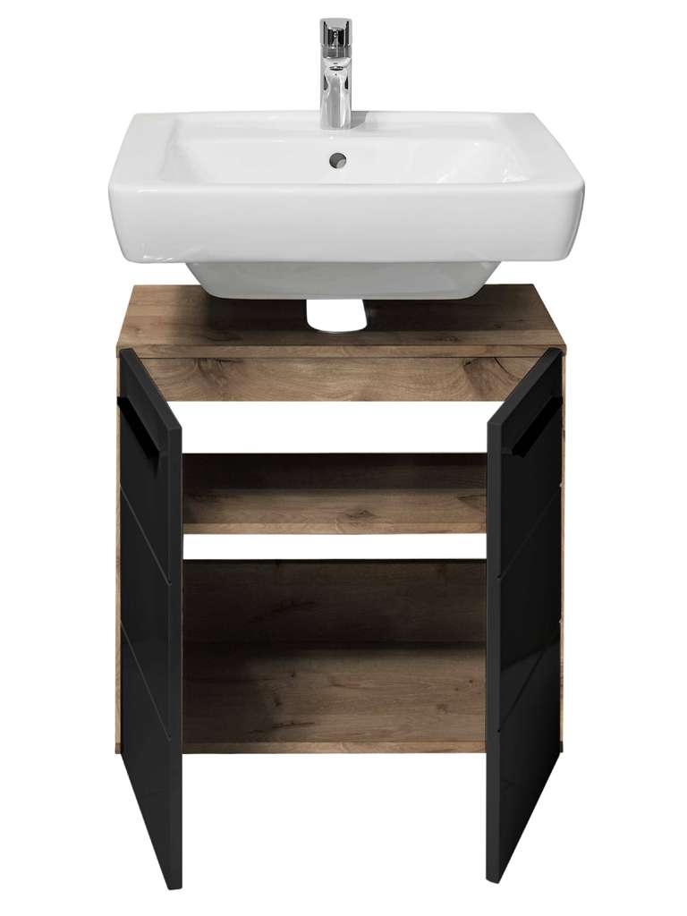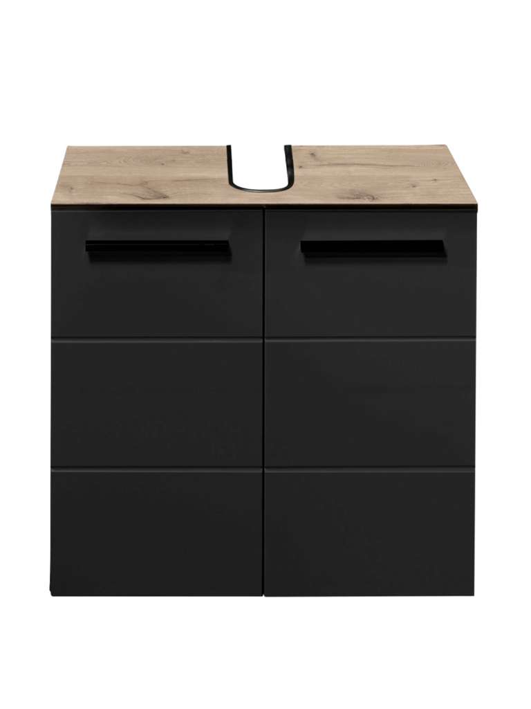 Upgrade your bathroom with the Vista Under Sink Cabinet, a perfect fusion of modern design and smart storage. Crafted from luxurious Viking Oak, this cabinet features a bold matte black finish that brings a sleek, contemporary edge to your space. Behind the two cupboard doors, you'll find two spacious shelves, offering ample room to stow away your bathroom essentials, from toiletries to cleaning supplies. This under-sink cabinet maximises style and functionality, creating a clutter-free, modern bathroom with effortless flair.
