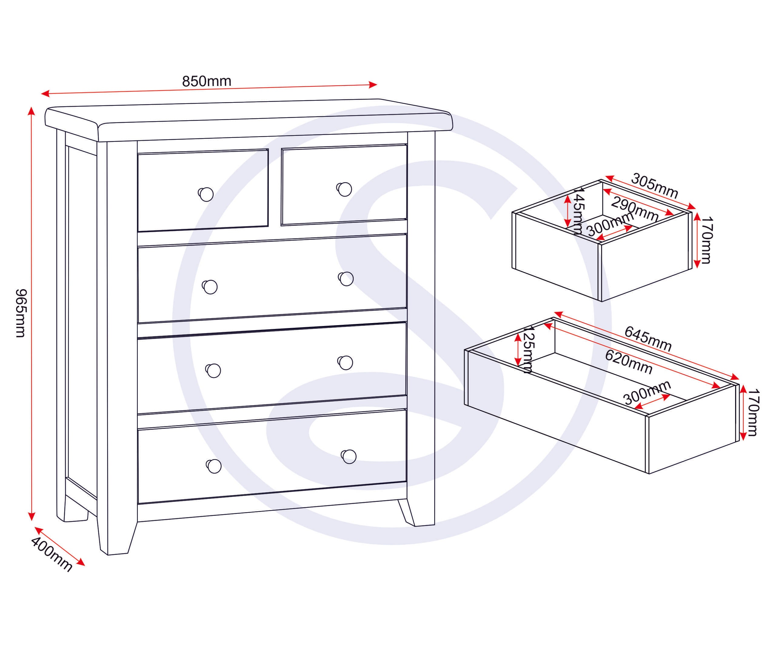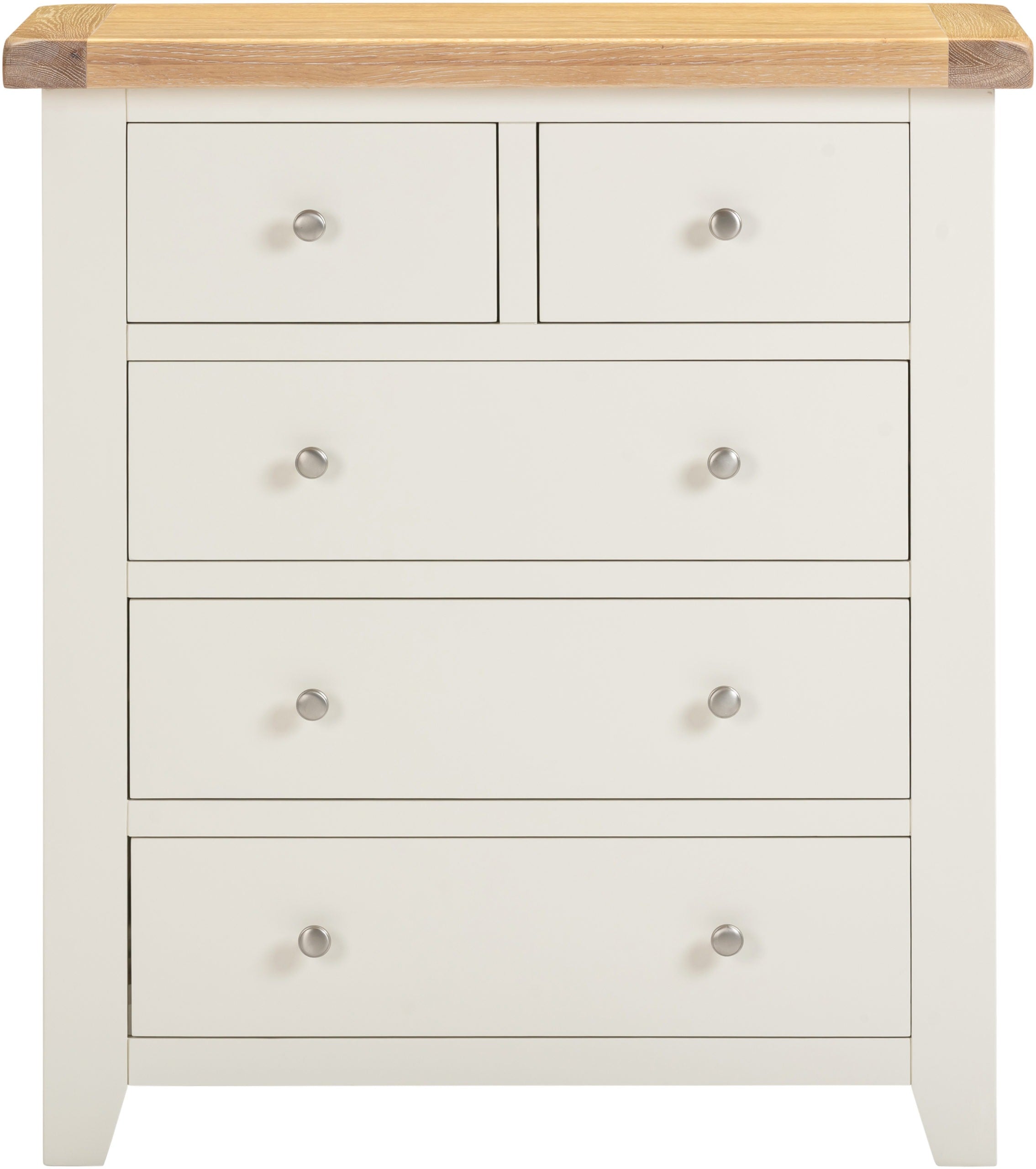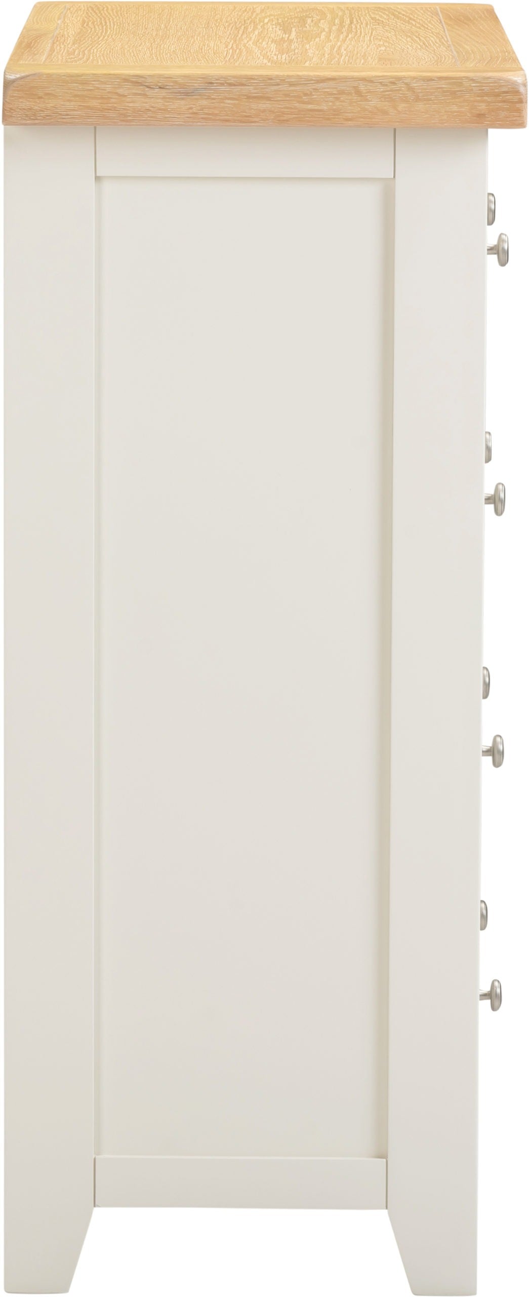 The Windsor 3+2 Drawer Chest finished in Ivory/Oak adds a homely touch with a modern edge. Thoughtfully designed for busy family spaces, it offers three roomy drawers and two cupboards to keep life neatly organised. Sturdy by design, it pairs simple lines with a quality feel that lasts.